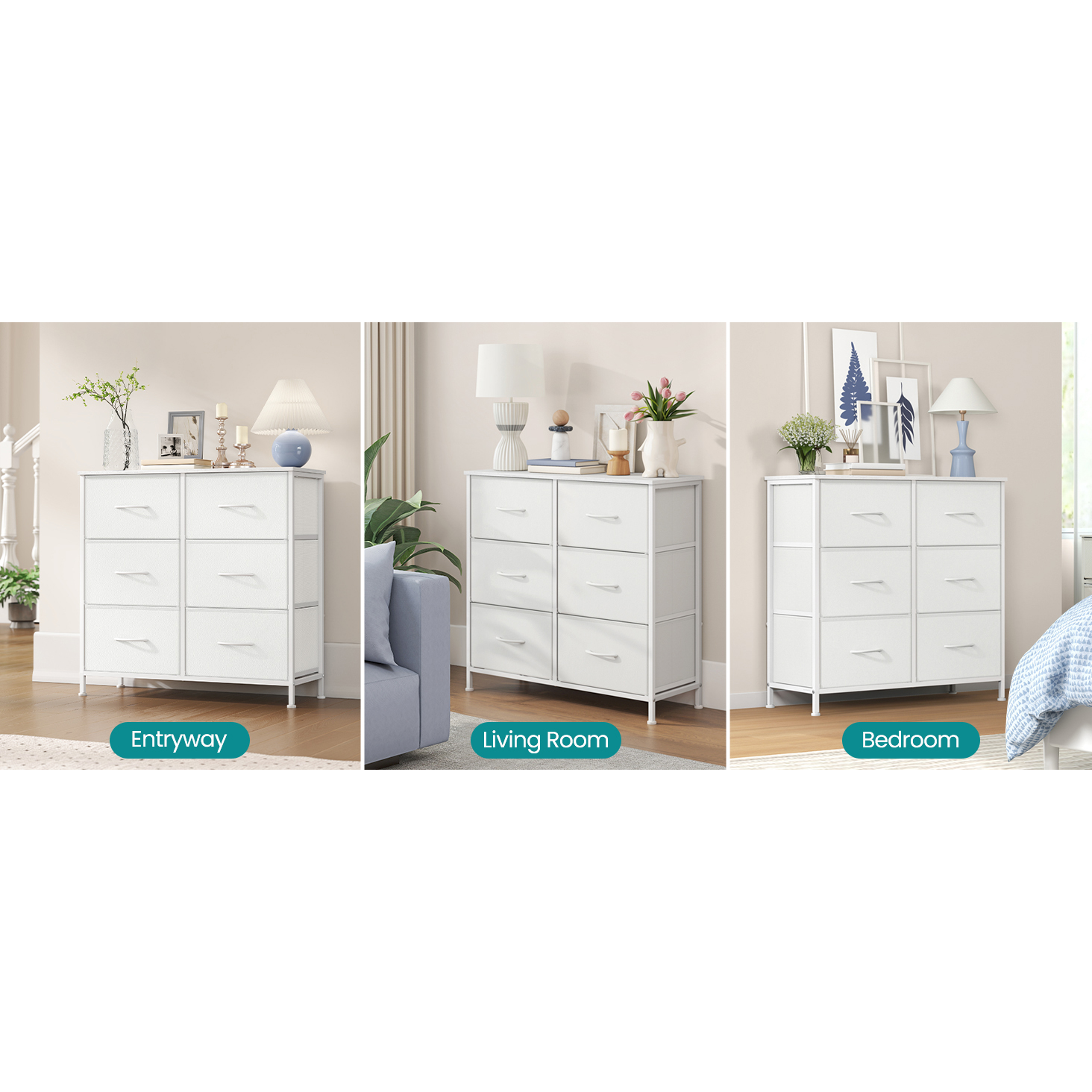 Organizează mai simplu hainele, accesoriile sau obiectele de zi cu zi cu această comodă cu 6 sertare de la SONGMICS. Designul modern, în nuanță albă, se potrivește ușor în dormitor, hol, living sau camera copilului, iar combinația dintre cadru metalic, blat din MDF și sertare textile oferă un echilibru excelent între rezistență, greutate redusă și aspect aerisit.