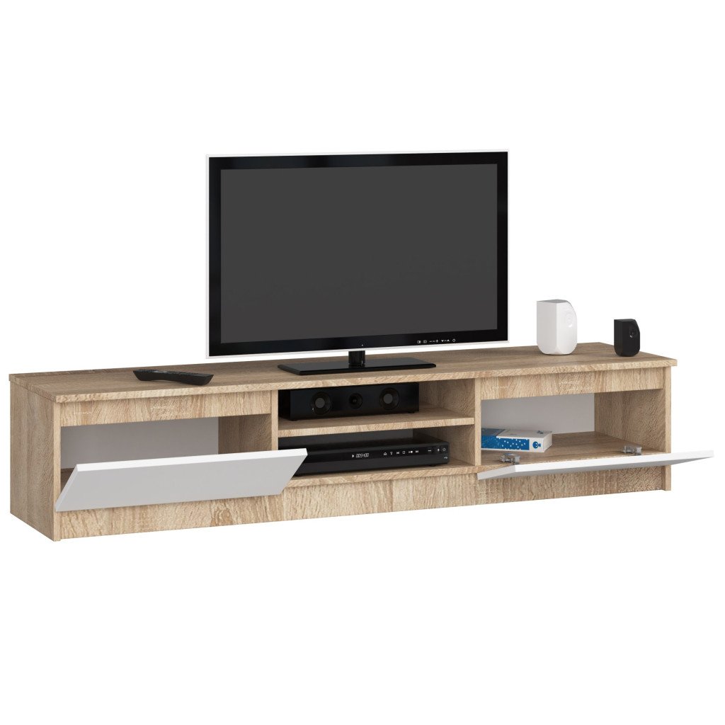 Comoda TV 160 cm cu 2 usi si rafturi, stejar sonoma si alb