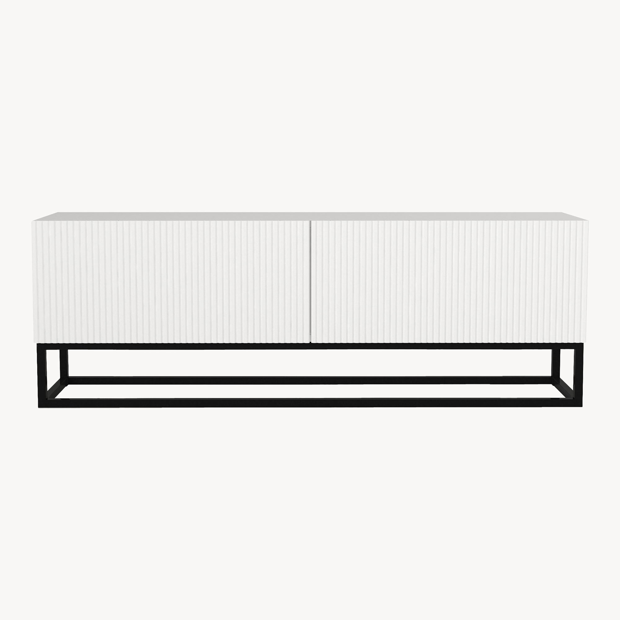 Comoda TV albă Verpsboga este alegerea ideală pentru un living modern, ordonat și elegant. Cu un design minimalist, front striat 3D și cadru metalic lung, această comodă TV se integrează ușor în decoruri contemporane și oferă un aspect rafinat zonei multimedia.