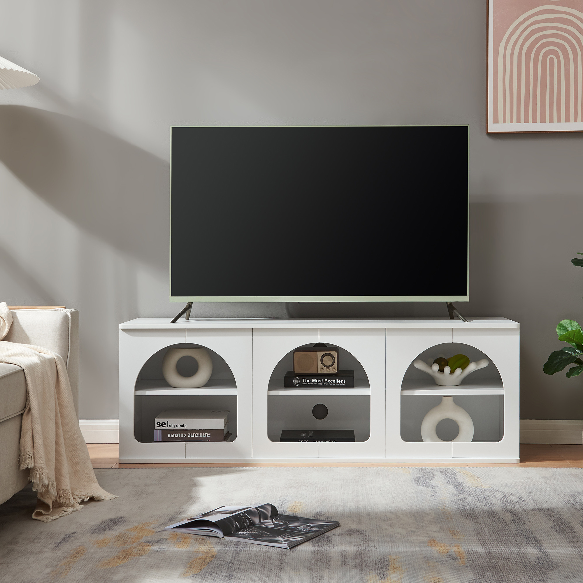 Comoda poate fi folosită ca mască TV sau mobilier pentru zona multimedia, fiind potrivită pentru organizarea echipamentelor electronice și a obiectelor decorative din living sau camera de relaxare.