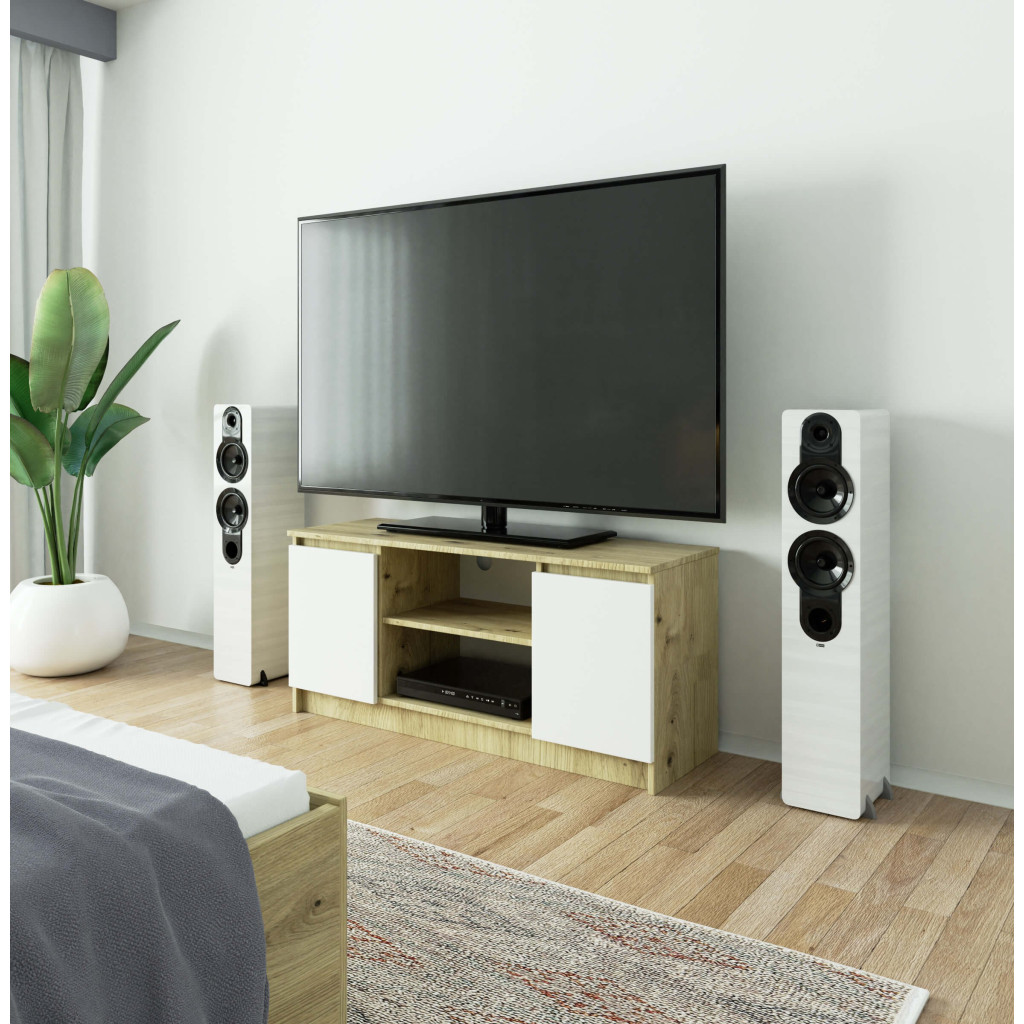 Comodă TV cu 2 uși și poliță, 120 cm, stejar artisan și alb