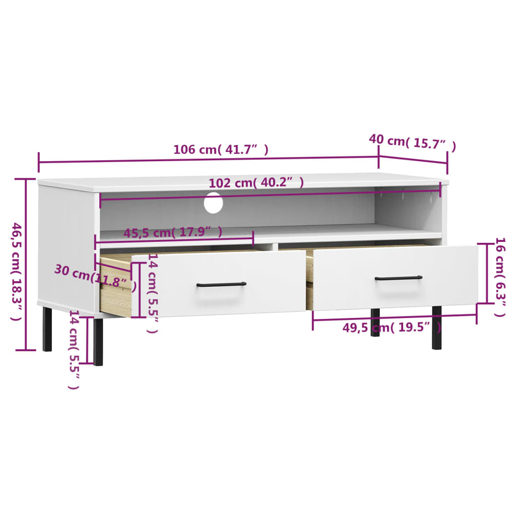 Comodă TV cu picioare metalice „OSLO”, alb, lemn masiv pin GartenMobel Dekor