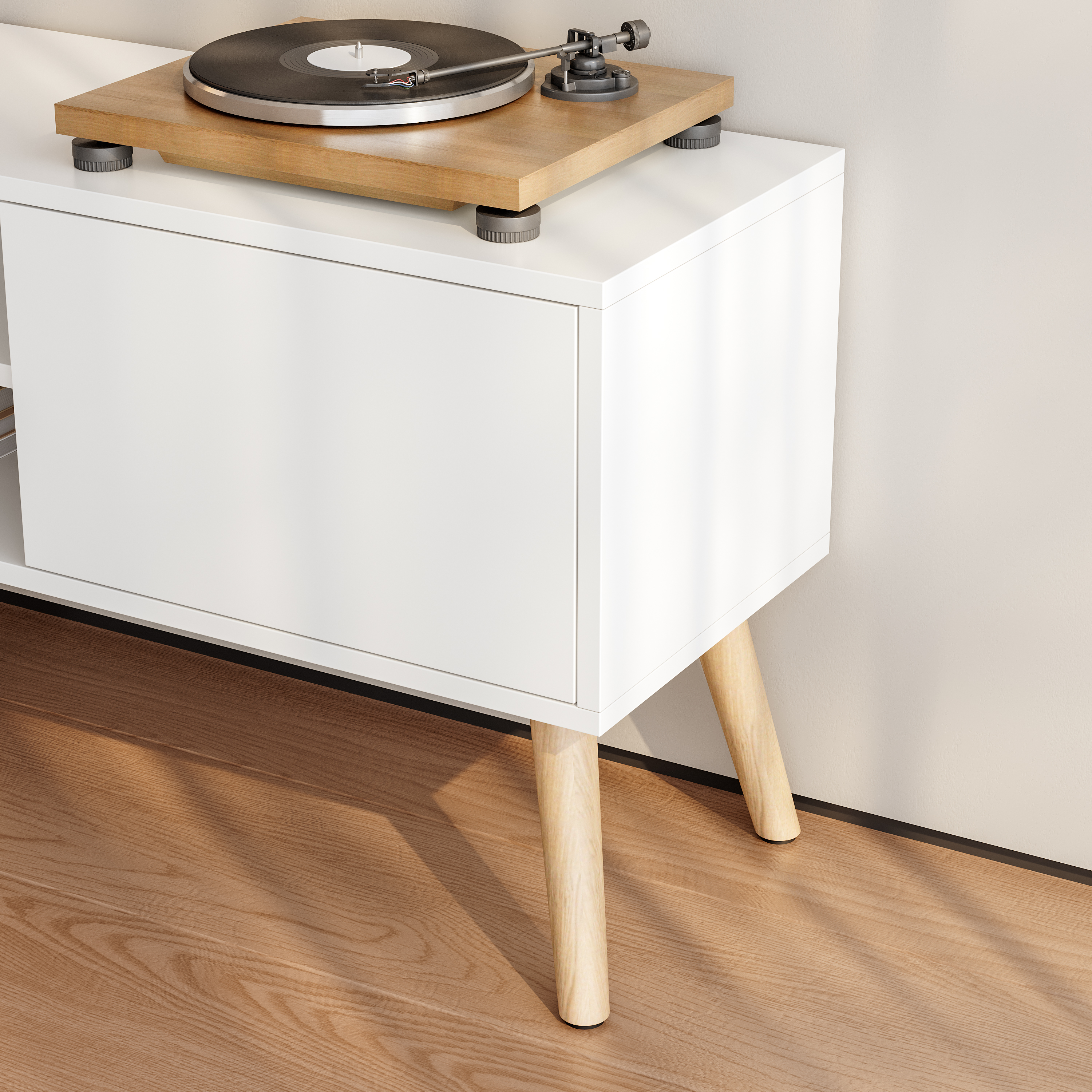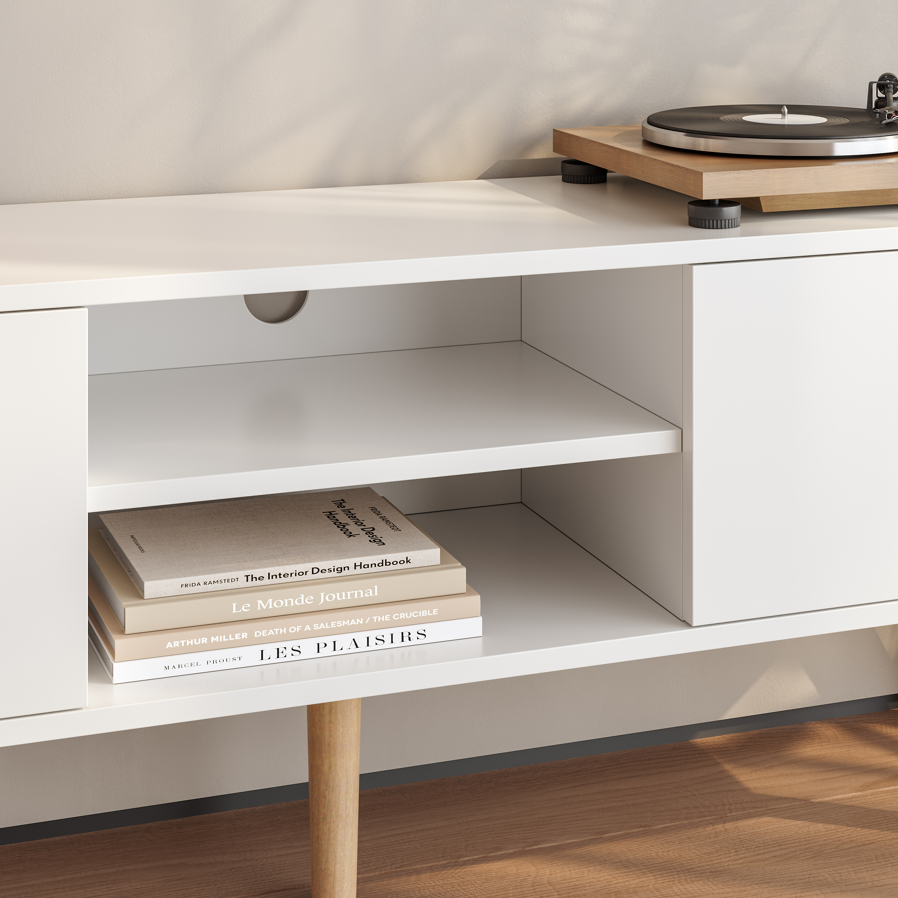 Comoda TV Eskilstuna este alegerea potrivită pentru un living modern, aerisit și bine organizat. Cu un design minimalist în finisaj alb și picioare cu aspect de stejar, această comodă TV albă oferă un echilibru plăcut între estetică și funcționalitate. Cele două uși laterale și cele două rafturi centrale creează spațiu util pentru depozitarea accesoriilor media, telecomenzilor, consolelor sau obiectelor decorative.