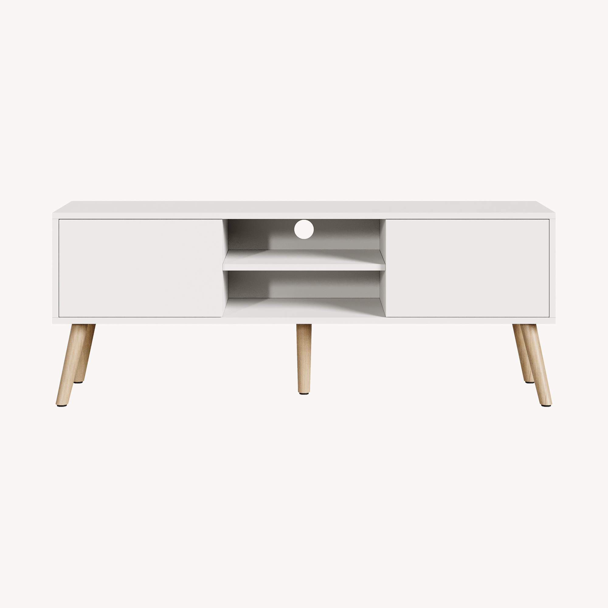 Comodă TV Eskilstuna albă cu 2 uși, 2 rafturi și picioare aspect stejar