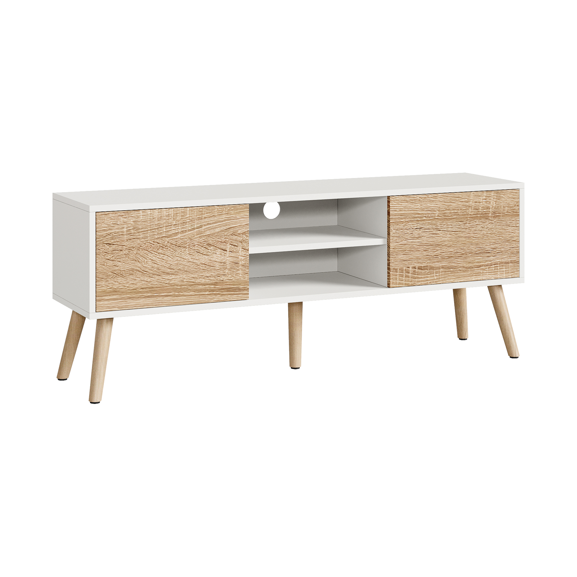 Datorită celor 2 uși de dulap și celor 2 rafturi deschise, mobilierul îți permite să organizezi eficient telecomenzi, cabluri, console sau dispozitive media. Orificiul discret pentru cabluri contribuie la un aspect curat, iar cele 5 picioare asigură stabilitate foarte bună în utilizarea de zi cu zi.