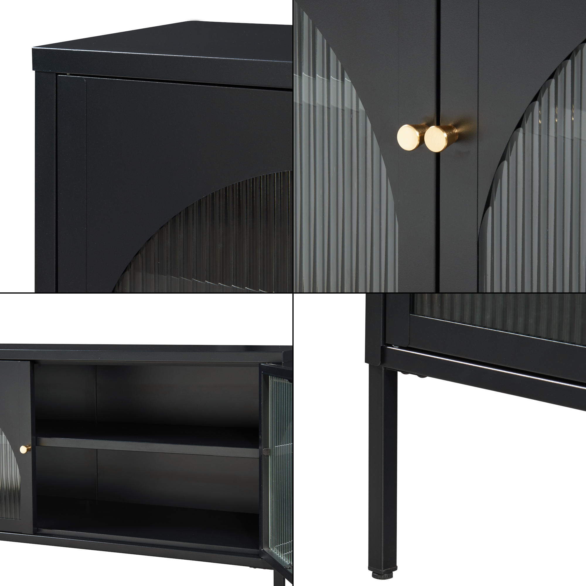 Alege o comodă TV modernă și practică pentru amenajarea livingului tău. Modelul Karlskrona impresionează prin designul elegant, finisajul negru mat și cele două uși din sticlă riflată, care oferă un aspect rafinat și contemporan. Este o piesă versatilă, potrivită atât ca suport pentru televizor, cât și ca bufet sau dulap pentru birou.