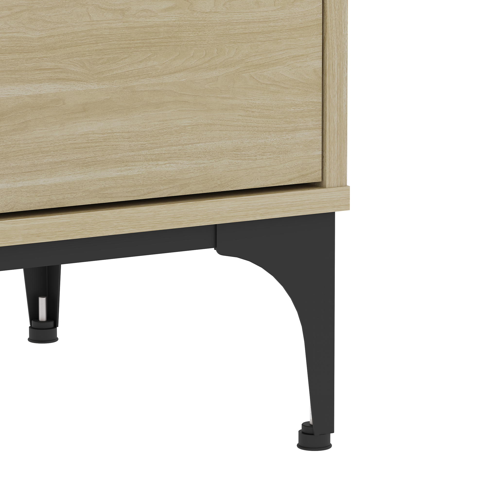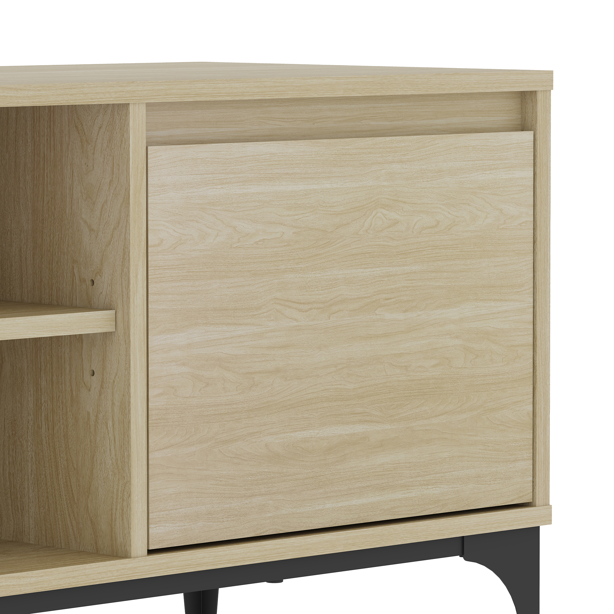 Adaugă un plus de stil și organizare în living cu această comodă TV modernă, realizată într-un decor elegant de stejar deschis și completată de un cadru metalic negru. Designul său echilibrat se integrează ușor în amenajări contemporane, scandinave sau minimaliste, oferind un spațiu practic pentru televizor și accesoriile multimedia.