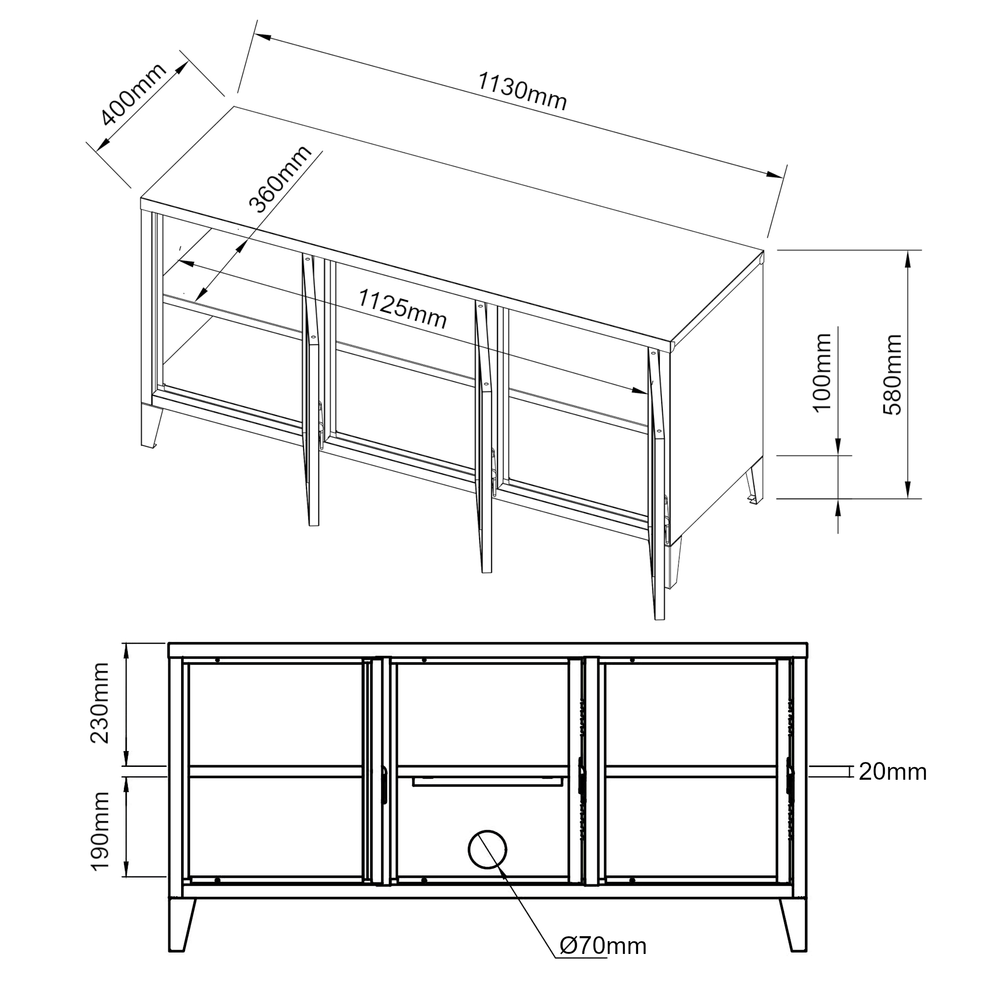 Blatul superior generos este potrivit pentru amplasarea televizorului, iar în spatele celor 3 uși se află un spațiu practic de depozitare pentru receiver, consolă de jocuri, player media sau alte obiecte utile. Datorită orificiului pentru cabluri din partea din spate, conexiunile rămân discrete și bine organizate.
