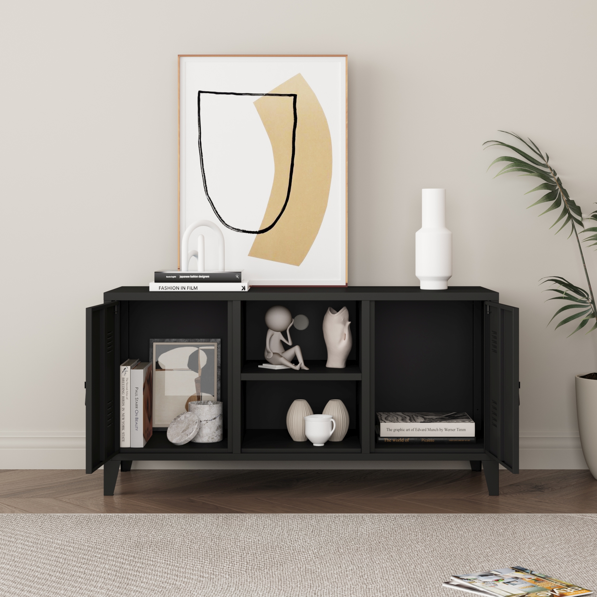 Această mobilă TV neagră poate fi folosită și ca sideboard sau dulap de birou, fiind o piesă versatilă pentru diferite încăperi. Ușile cu mânere și fante de aerisire, picioarele stabile și suprafața rezistentă la zgârieturi completează un produs practic, ușor de întreținut și simplu de integrat în decor.