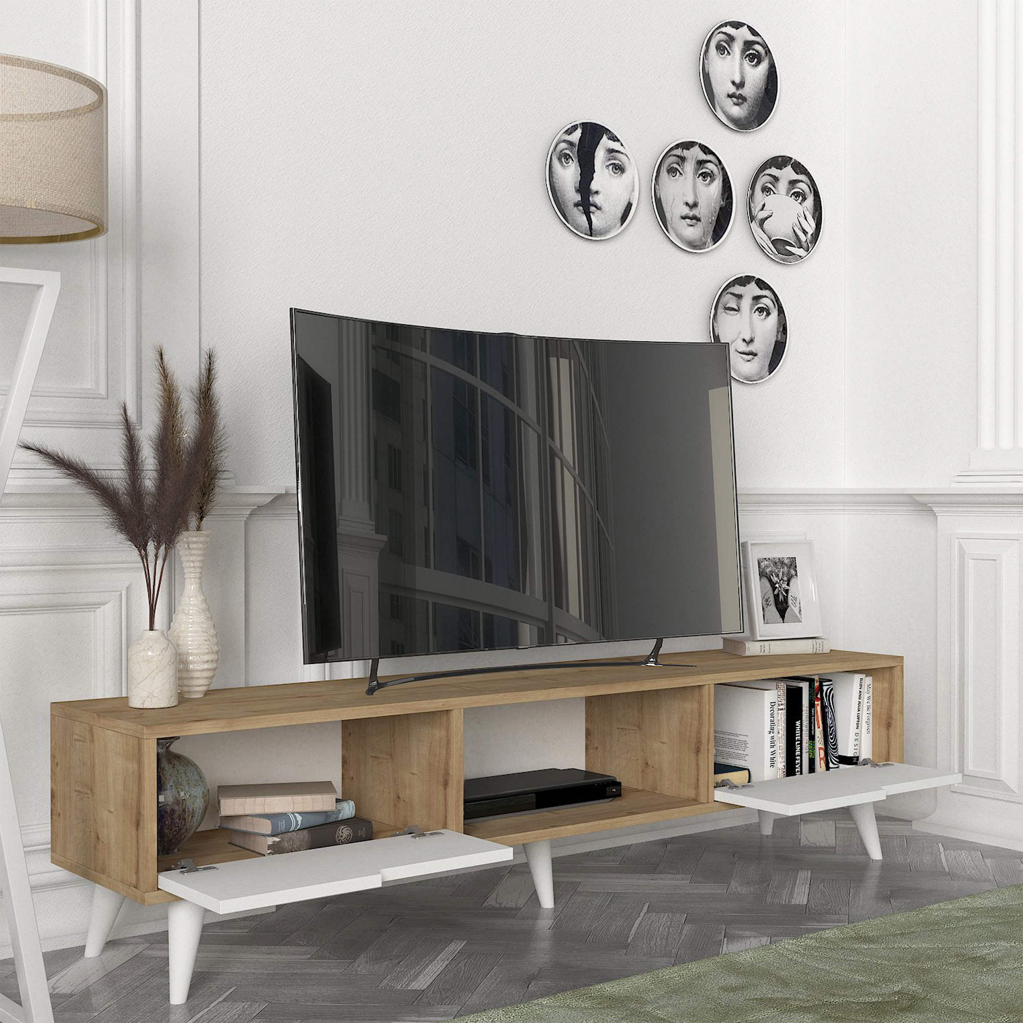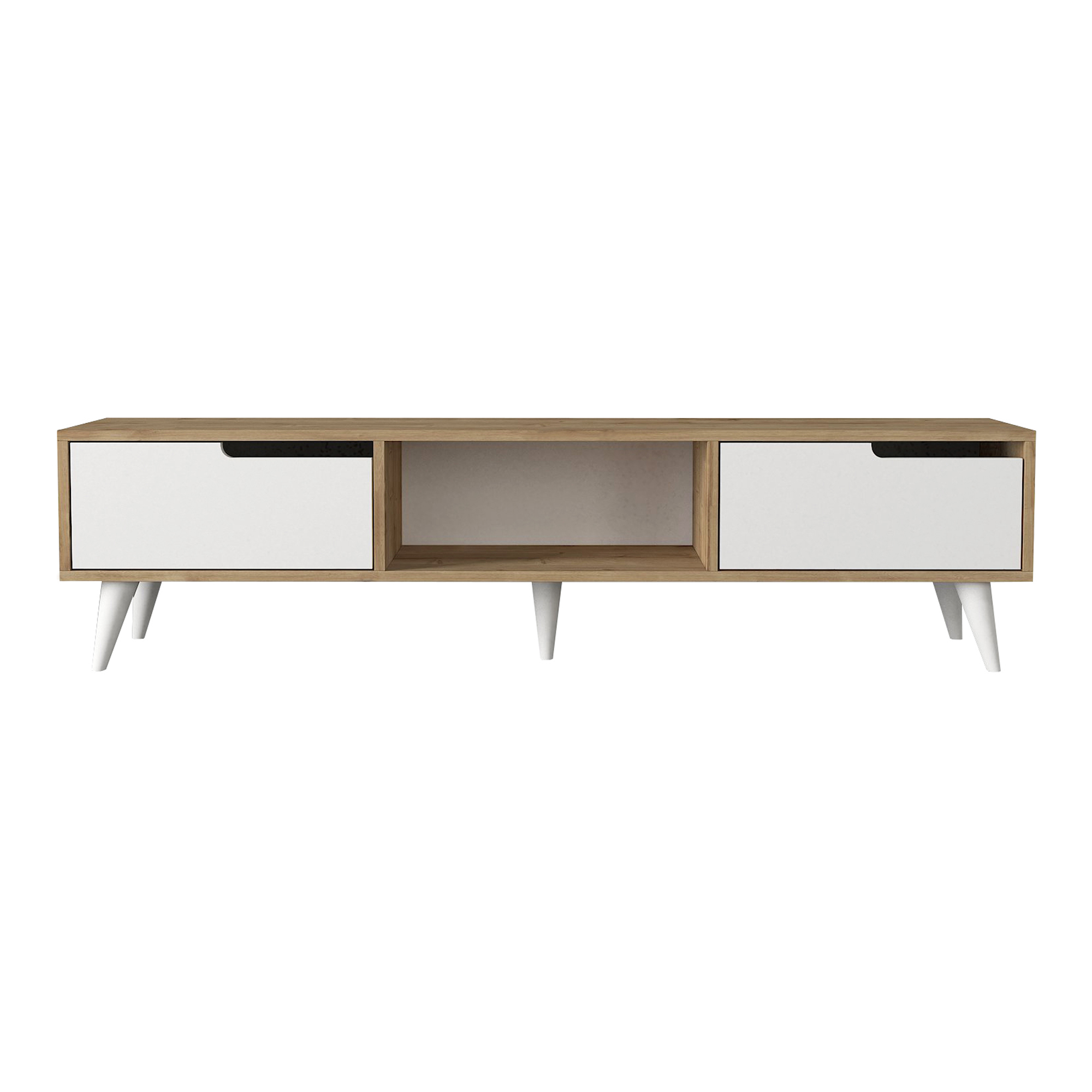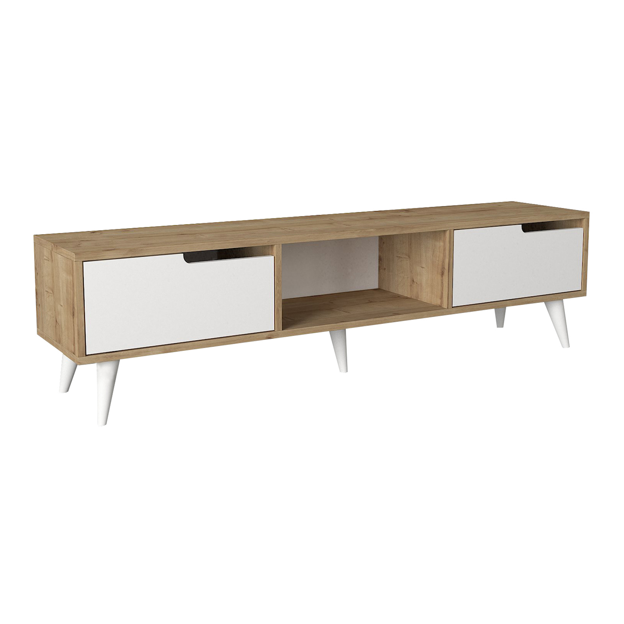 Comodă TV Kullila – o alegere practică și elegantă pentru un living modern. Cu un design curat în nuanțe de stejar natur și alb, această comodă TV oferă spațiu generos pentru televizor, accesorii media și obiecte pe care vrei să le ai mereu la îndemână.