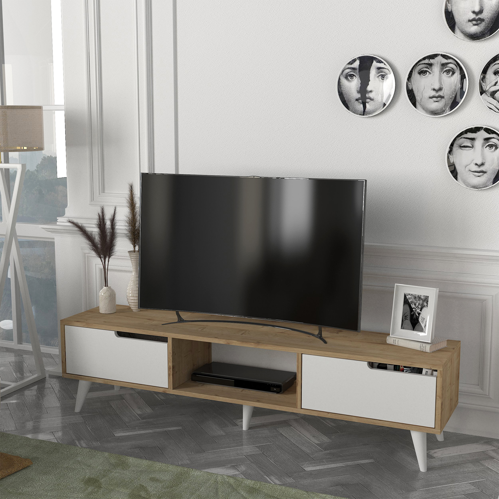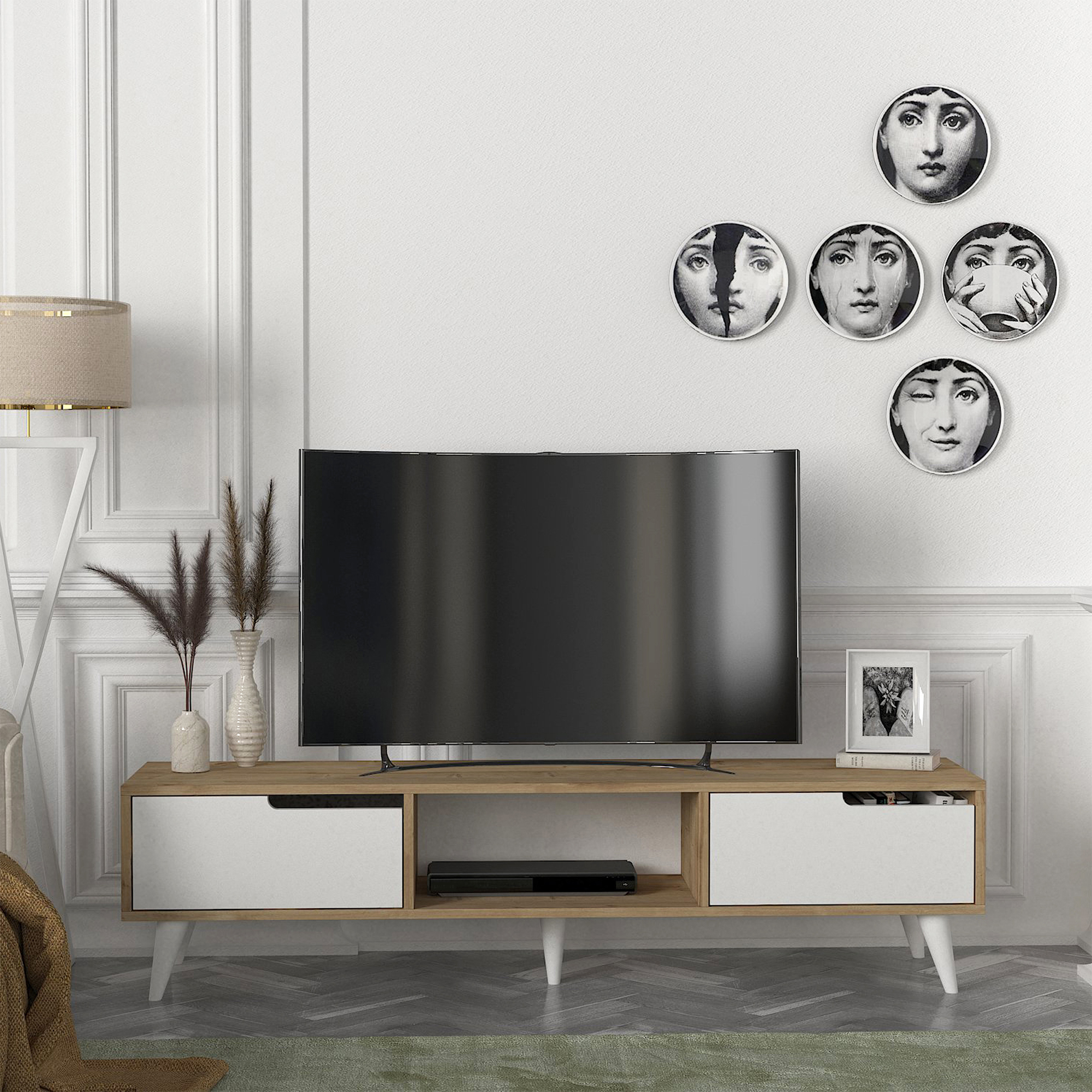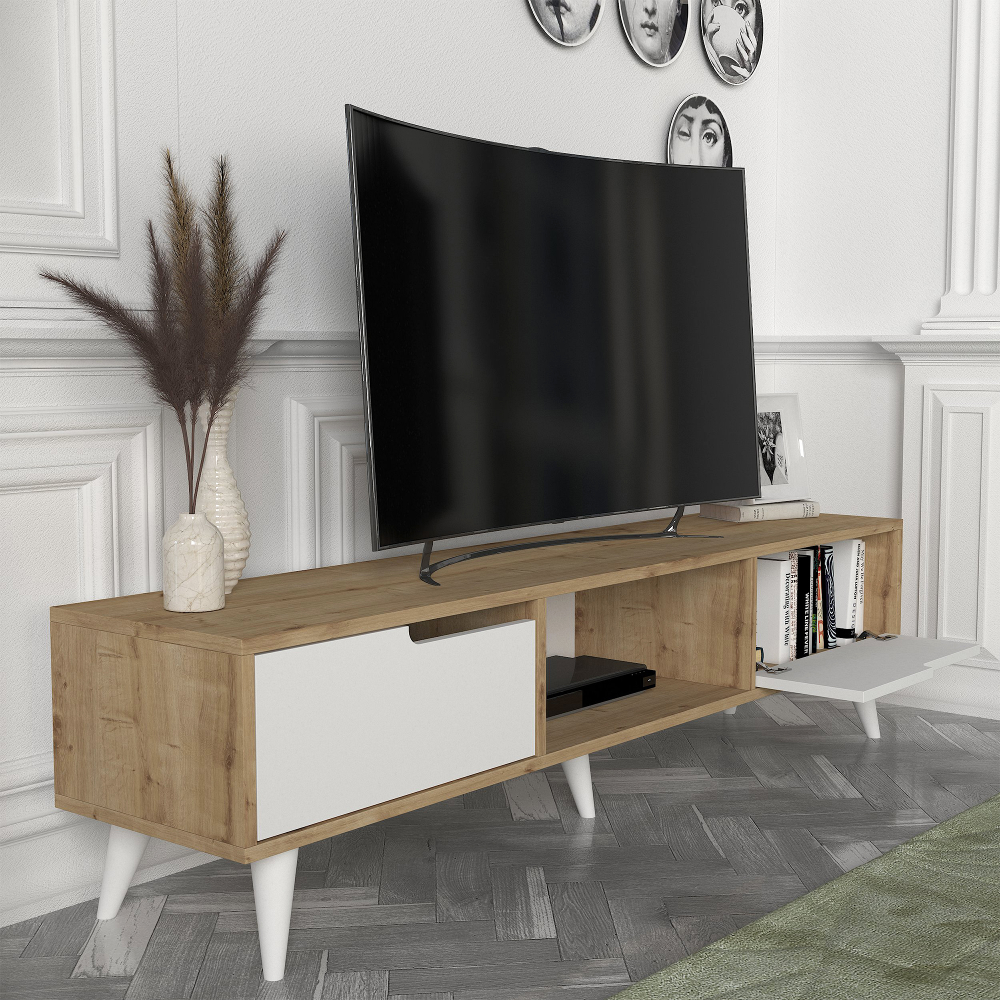 Comodă TV Kullila – o alegere practică și elegantă pentru un living modern. Cu un design curat în nuanțe de stejar natur și alb, această comodă TV oferă spațiu generos pentru televizor, accesorii media și obiecte pe care vrei să le ai mereu la îndemână.