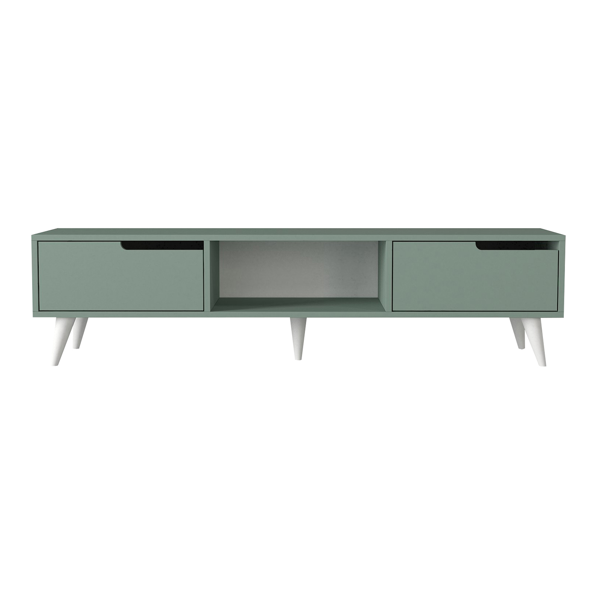 Comodă TV Kullila – o alegere practică și elegantă pentru un living modern. Cu un design curat, în nuanță verde cu picioare albe, această comodă TV oferă spațiu generos pentru televizor, accesorii media și obiecte pe care vrei să le ai mereu la îndemână.