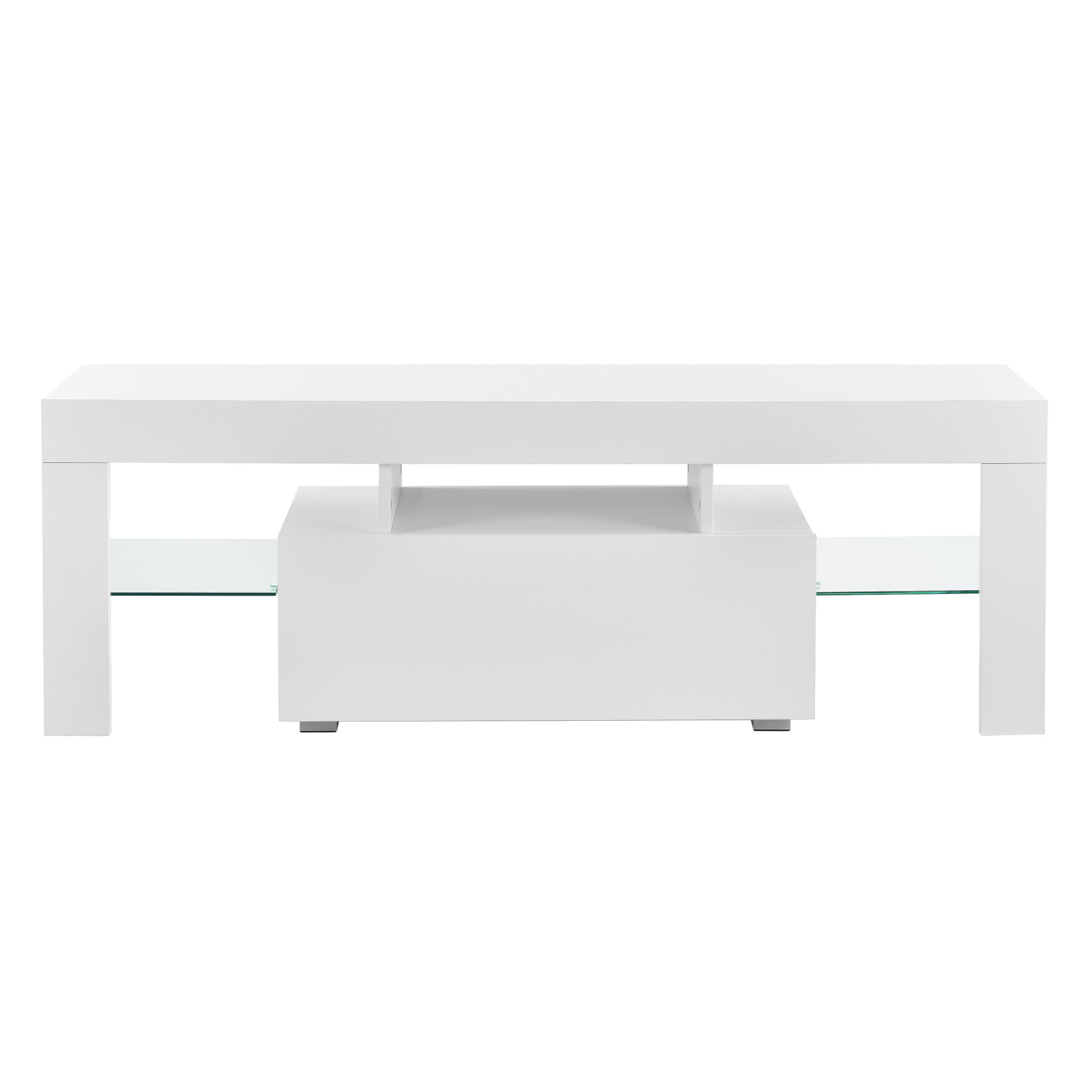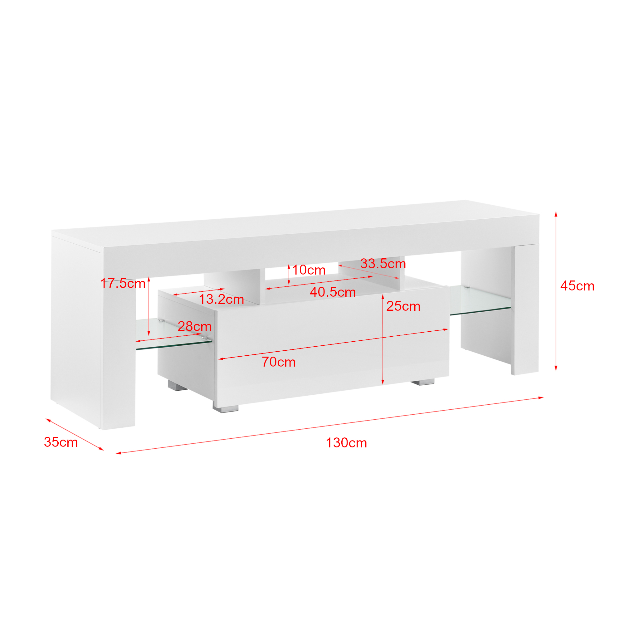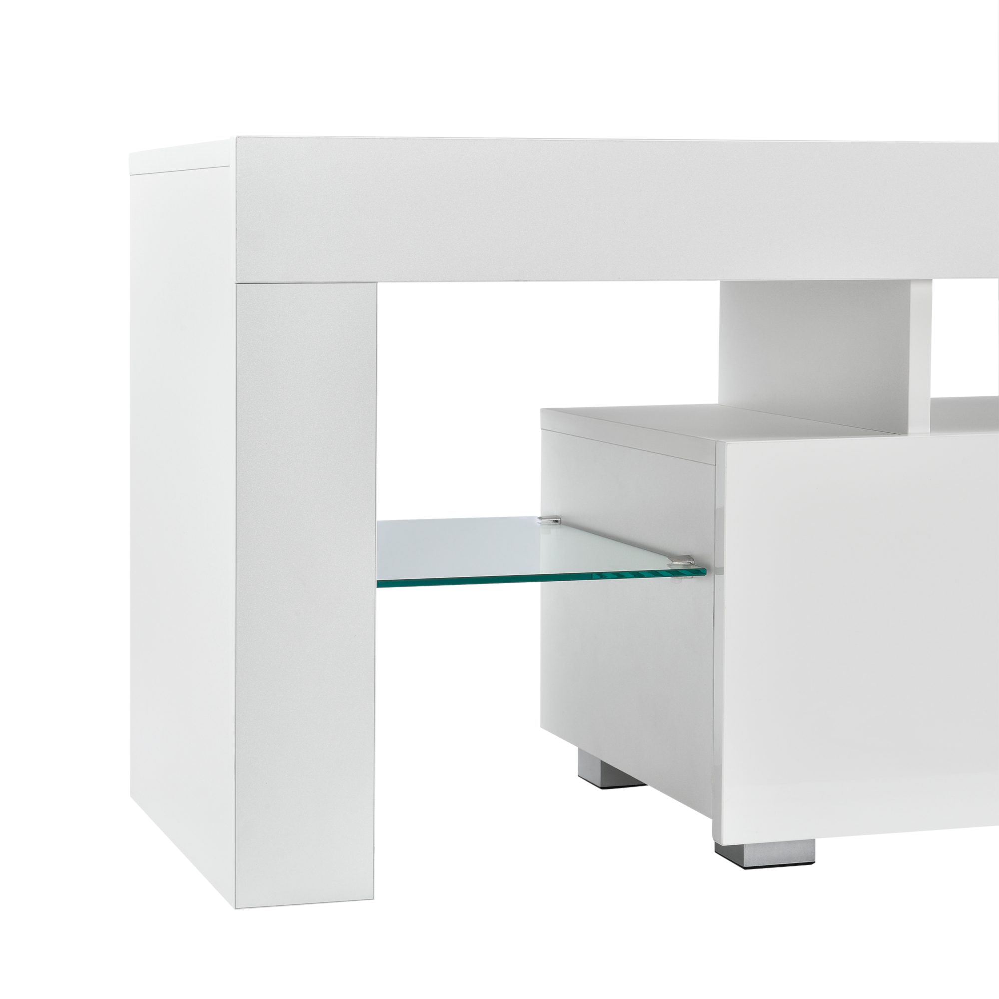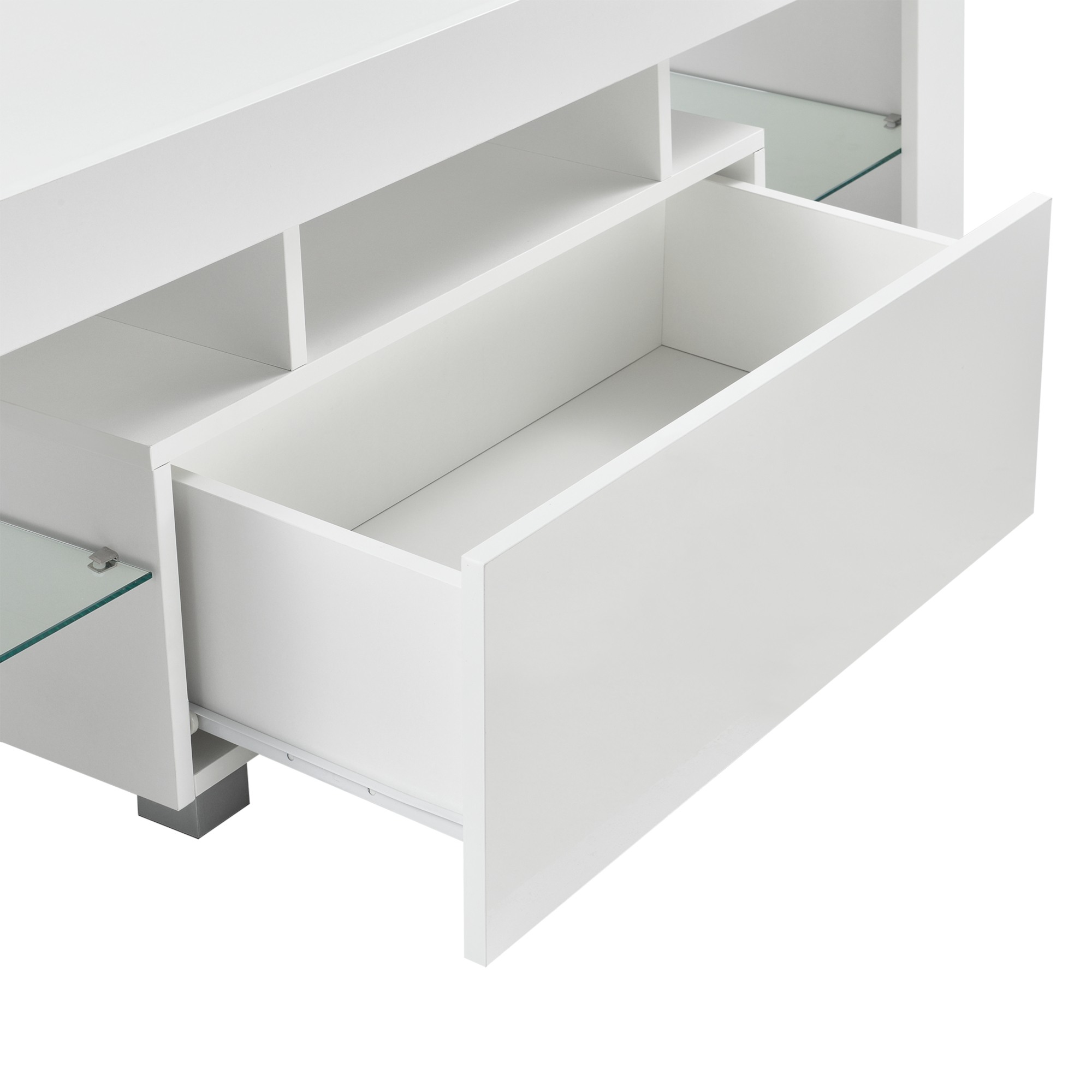 Comodă TV LED Grimsey albă cu sertar și rafturi din sticlă 130 cm