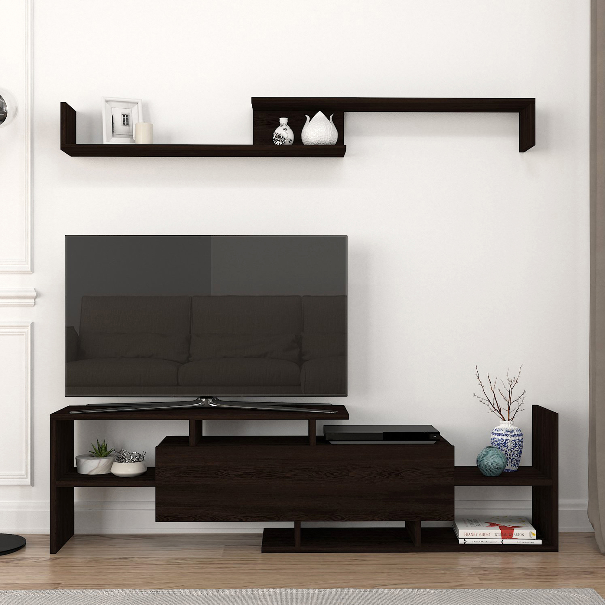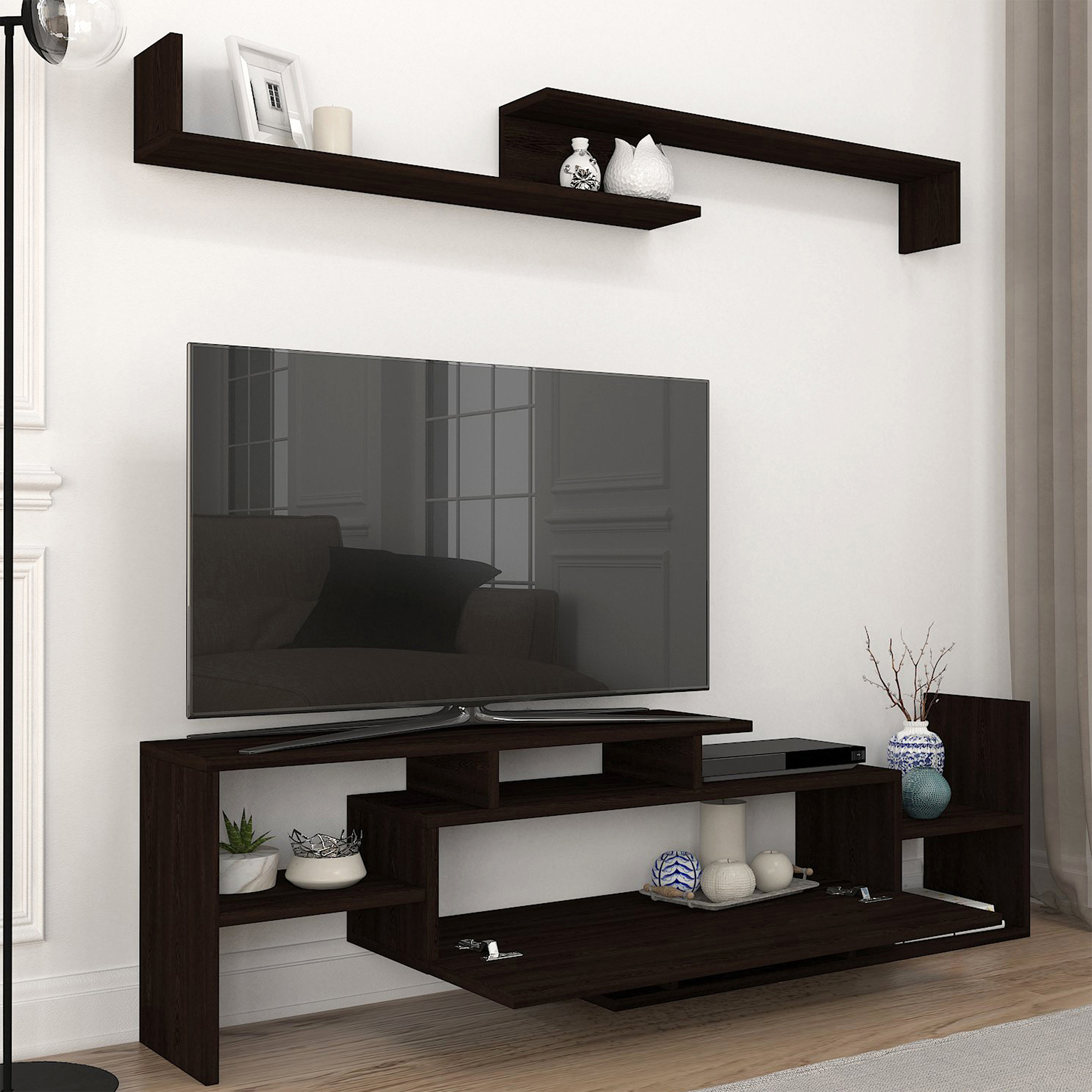 Setul este recomandat pentru living, cameră de zi sau colț multimedia. Poate fi folosit pentru susținerea televizorului și organizarea dispozitivelor electronice, în timp ce raftul suspendat adaugă spațiu util pentru decor și obiecte personale.