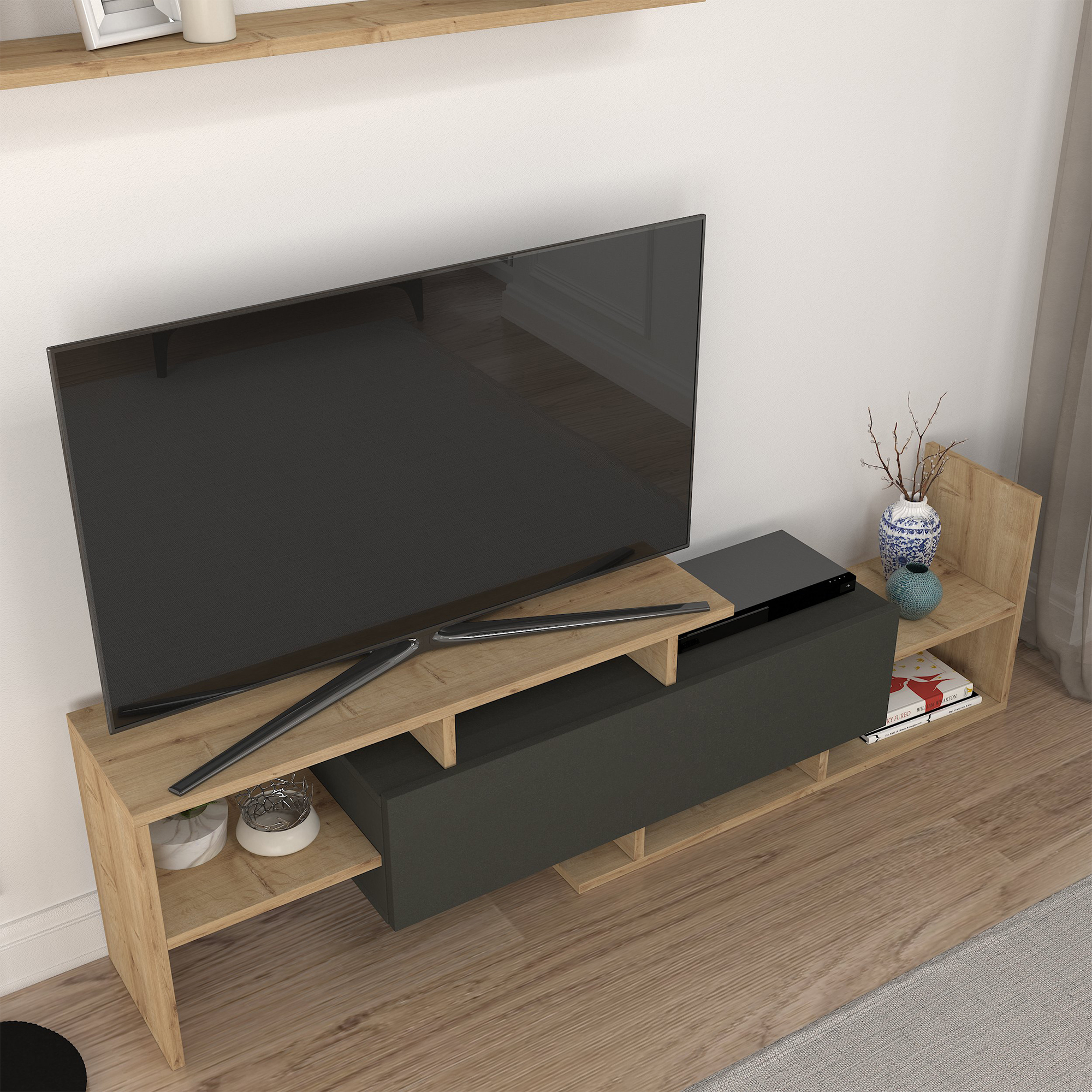 Suprafața superioară a corpului TV oferă loc suficient pentru televizor, iar compartimentele deschise sunt ideale pentru receiver, consolă de jocuri, DVD player sau alte accesorii. Dulapul cu ușă completează ansamblul cu un plus de spațiu de depozitare, astfel încât obiectele să fie păstrate ordonat și la îndemână.