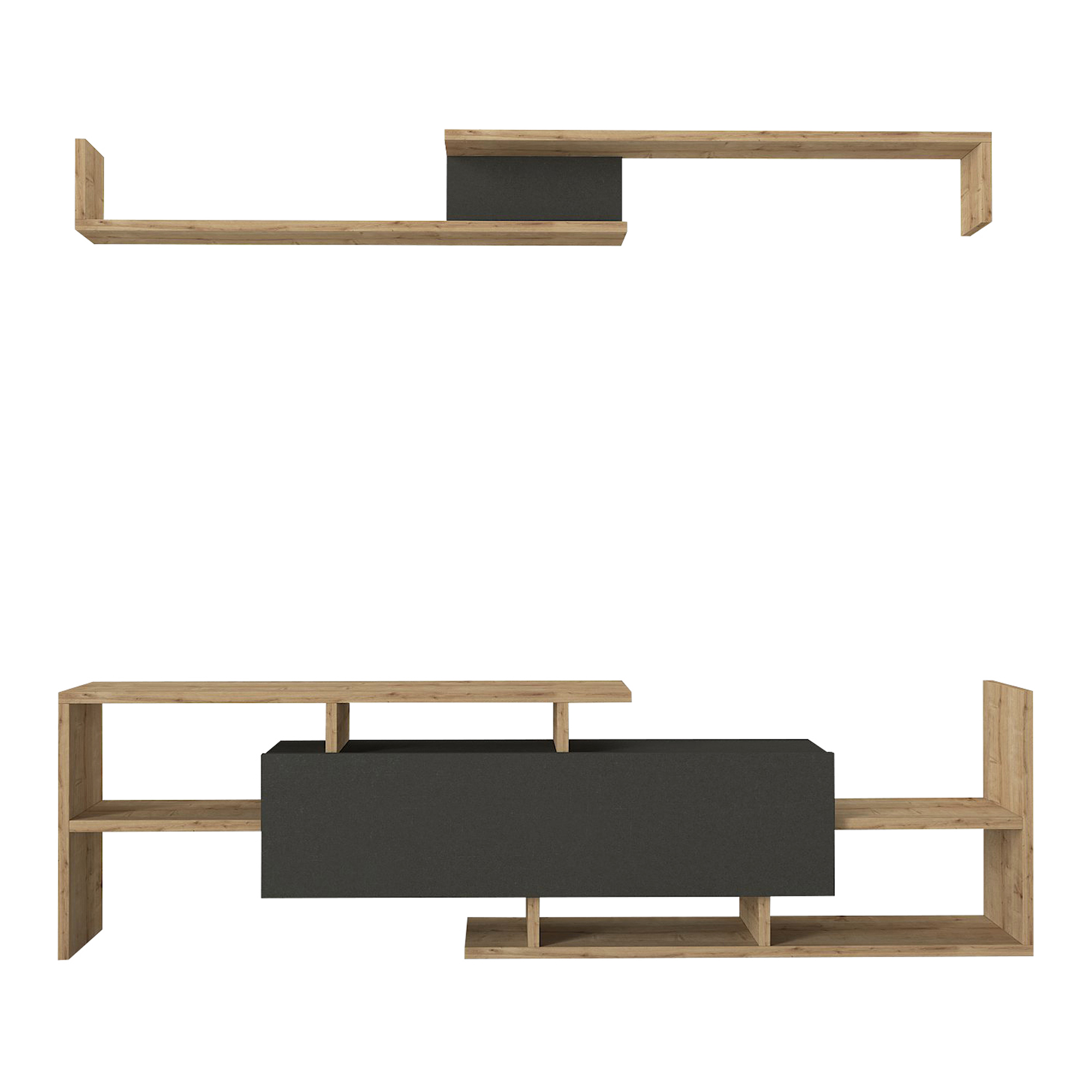 Setul este potrivit pentru amenajarea zonei TV din living, dormitor sau spațiu multimedia. Poate susține televizorul și aparatura aferentă, în timp ce raftul de perete oferă un loc suplimentar pentru obiecte decorative și accesorii utile.