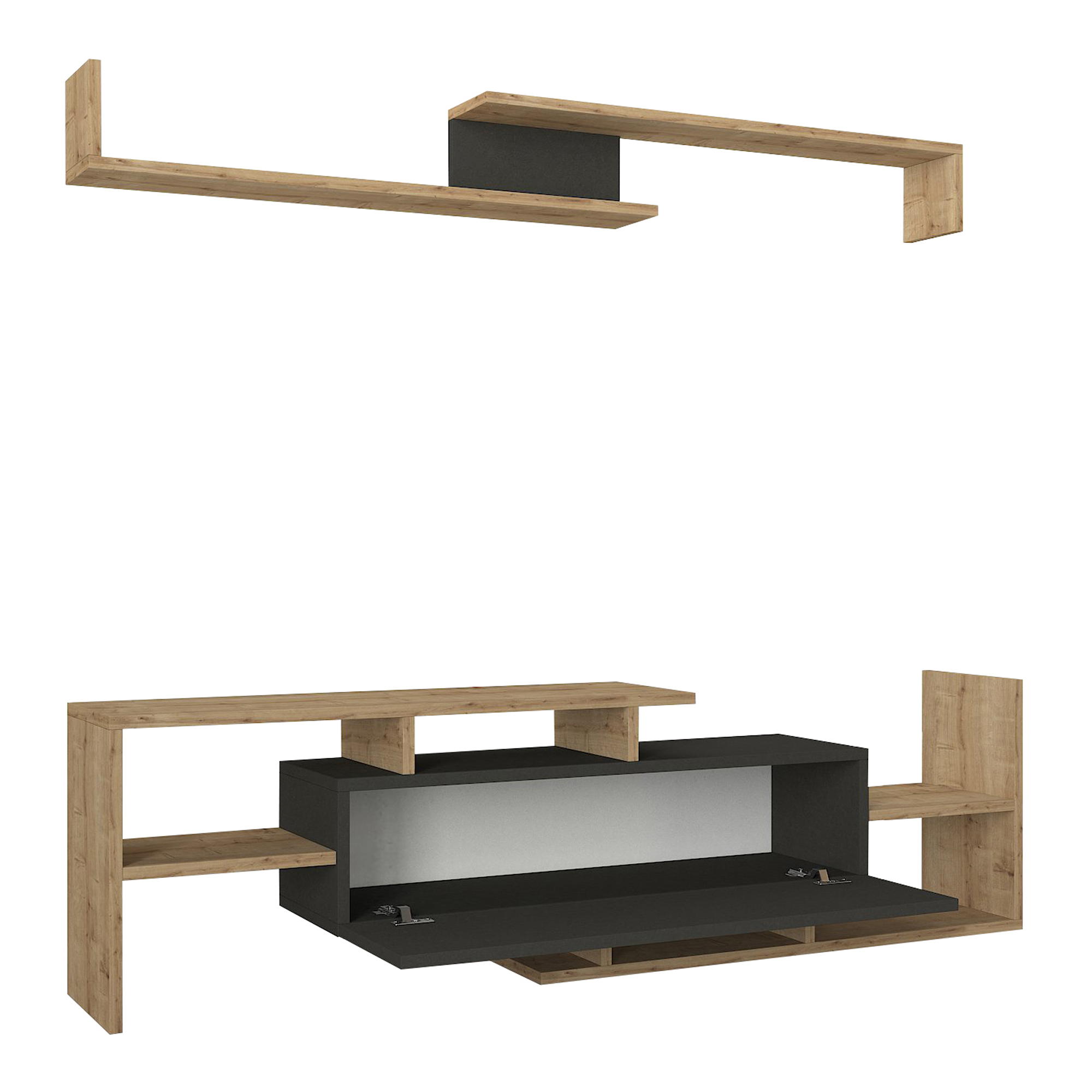 - Conținut pachet: 1 x comodă TV, 1 x raft de perete, 1 x instrucțiuni de montaj