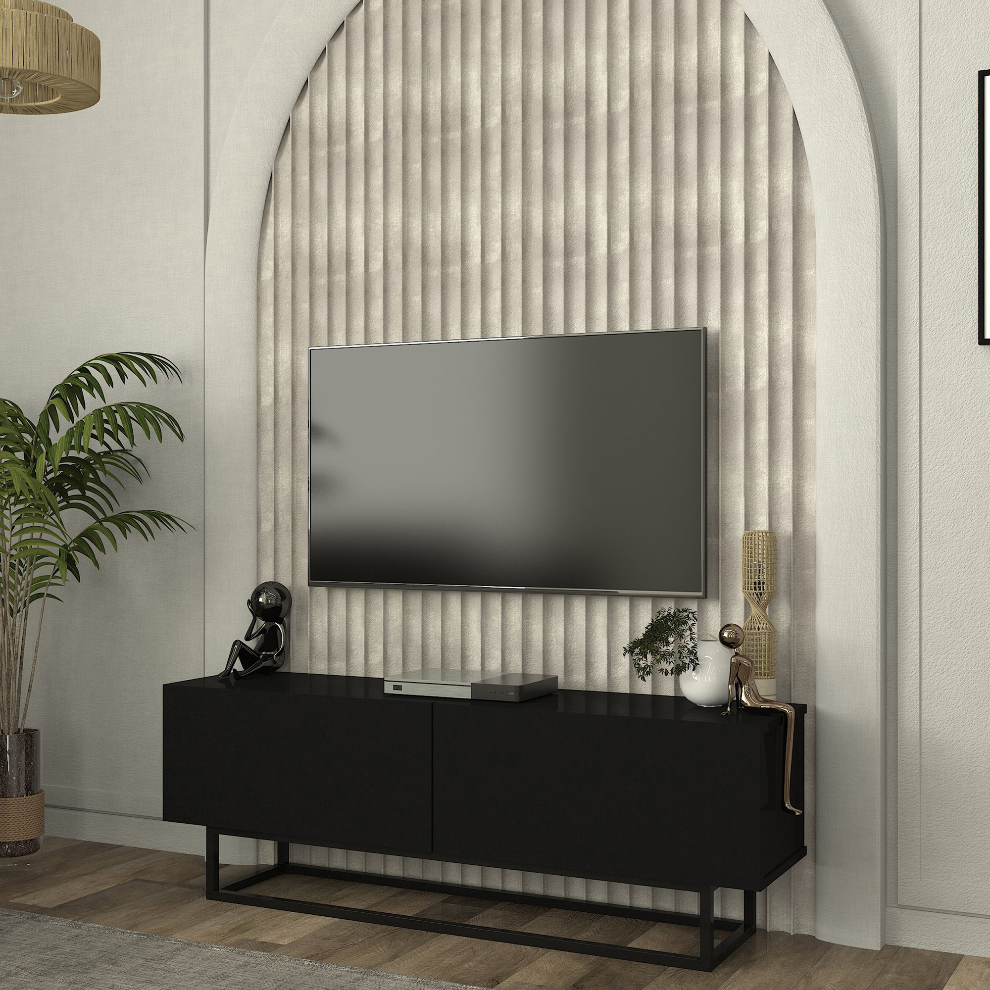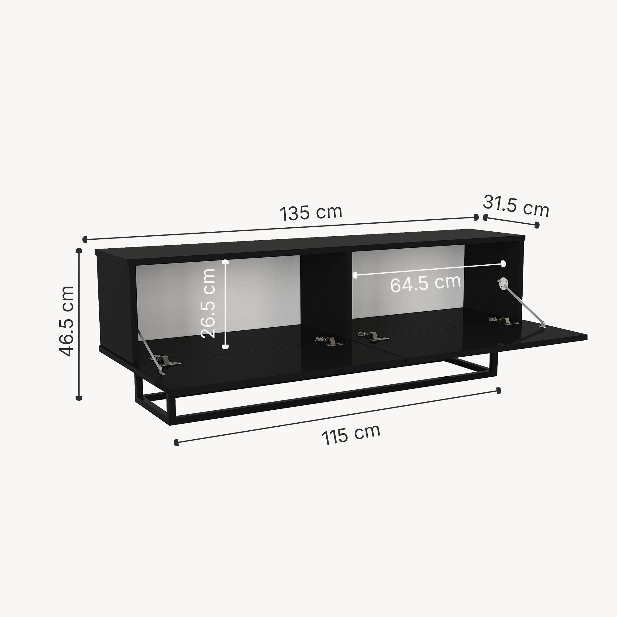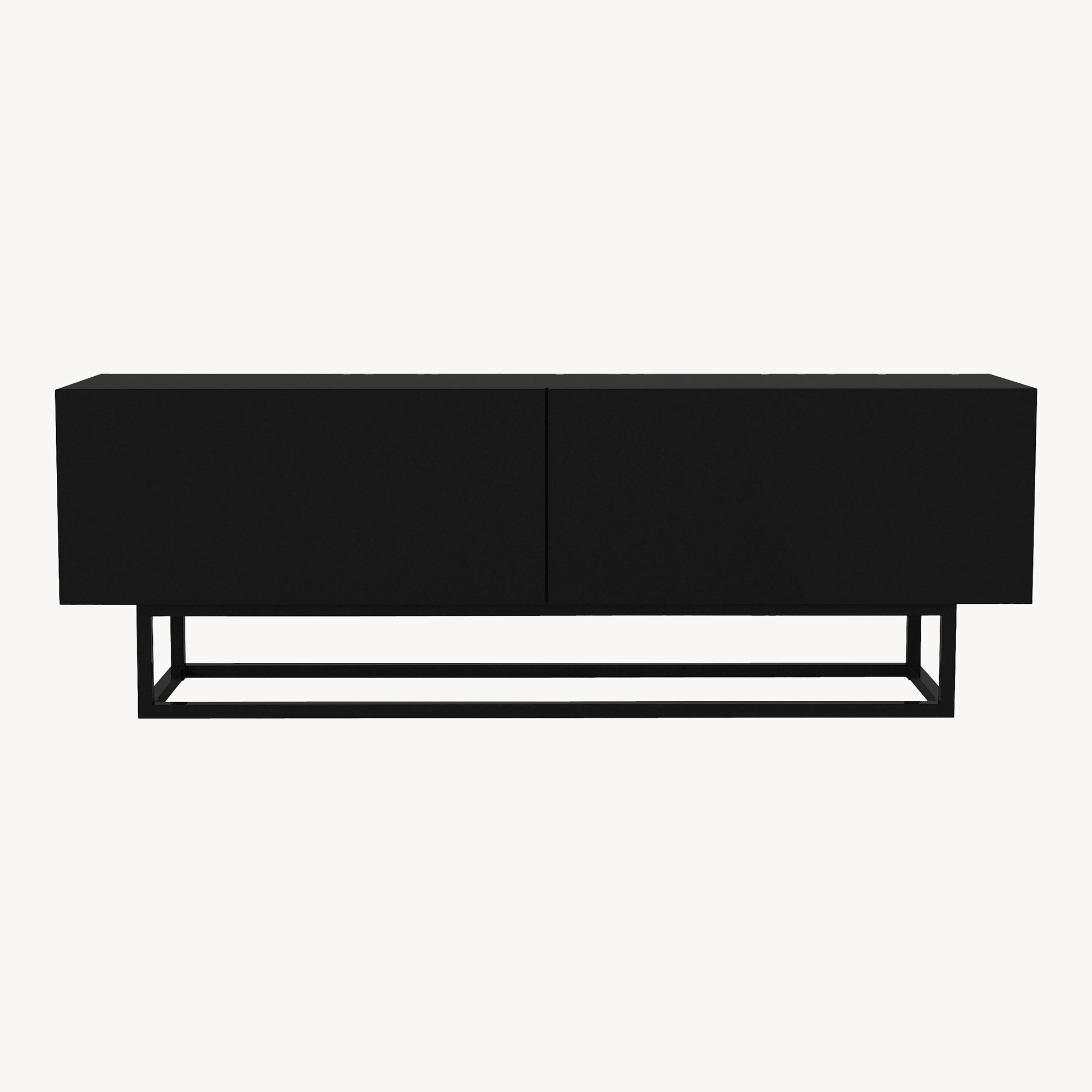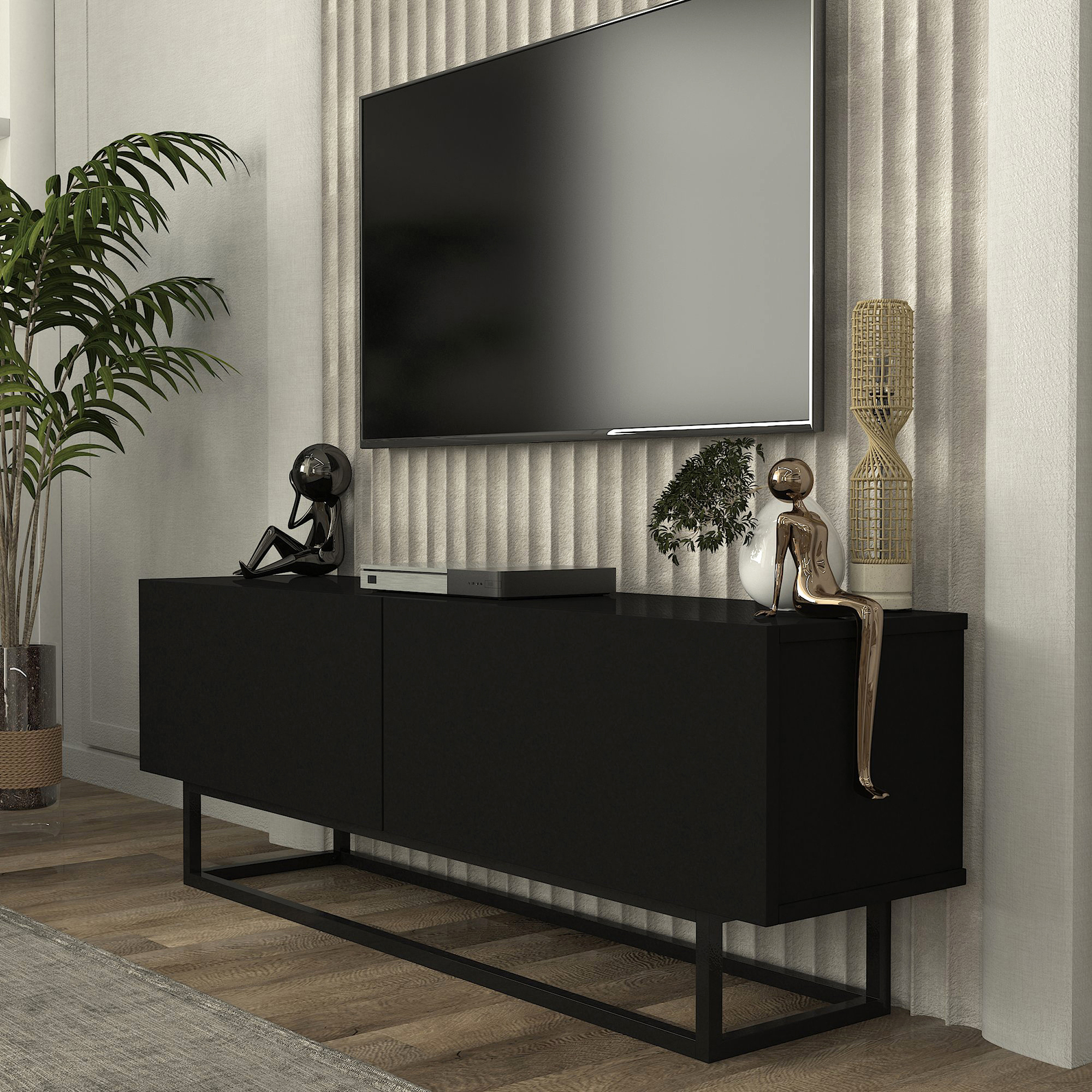 Comodă TV Nolven 135 cm neagră cu 2 uși rabatabile și cadru metalic