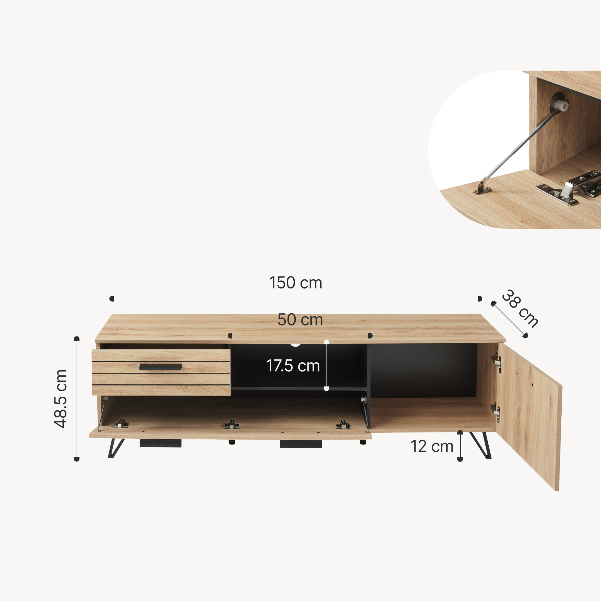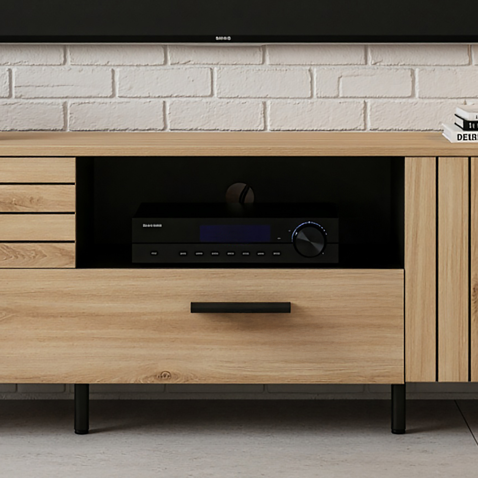 Blatul superior este ideal pentru amplasarea televizorului, iar compartimentul deschis din centru este potrivit pentru consolă, receiver sau player media. În plus, sertarul, compartimentul cu clapetă și dulapul lateral îți oferă soluții eficiente de organizare pentru telecomenzi, jocuri, cabluri, DVD-uri sau alte obiecte utile din zona de entertainment.