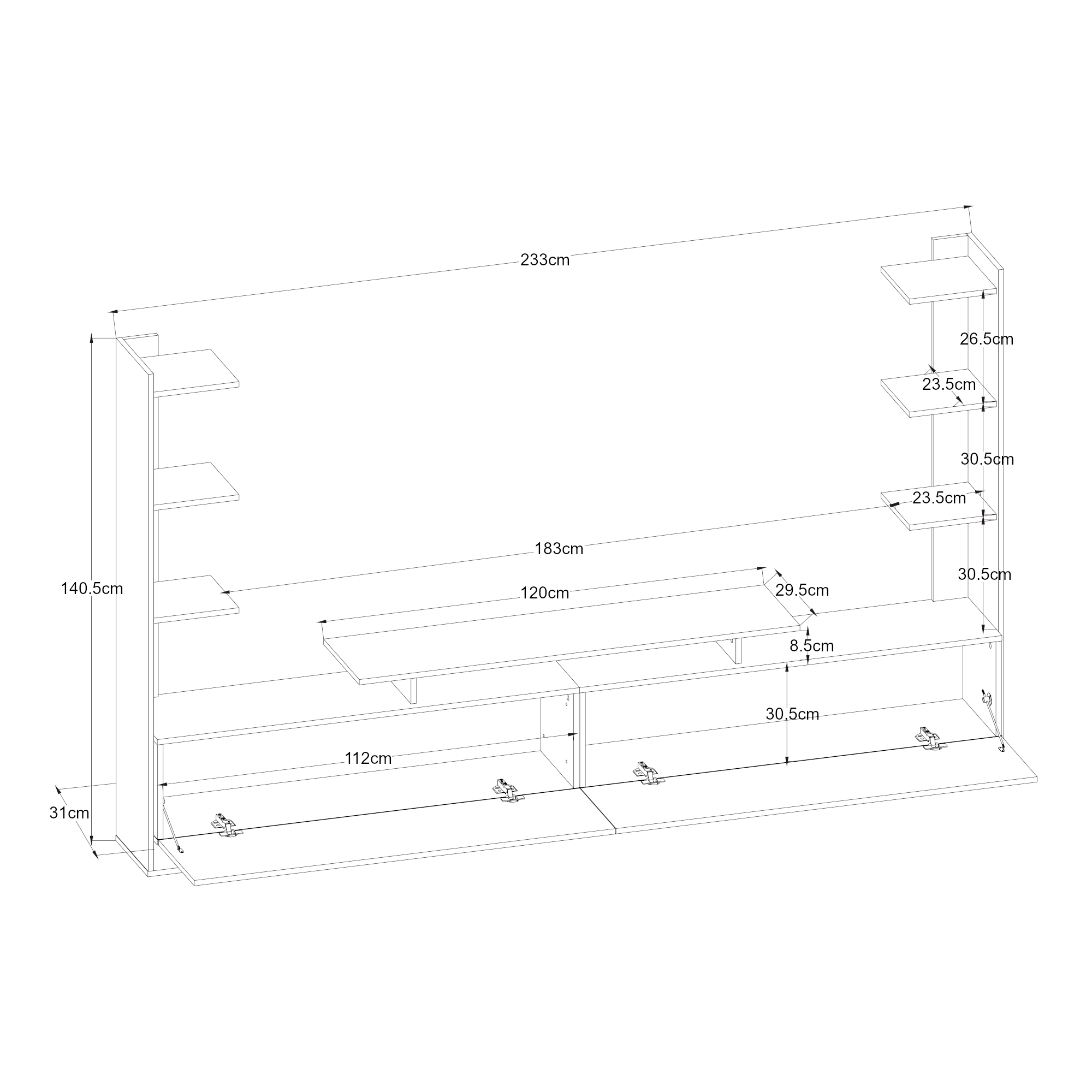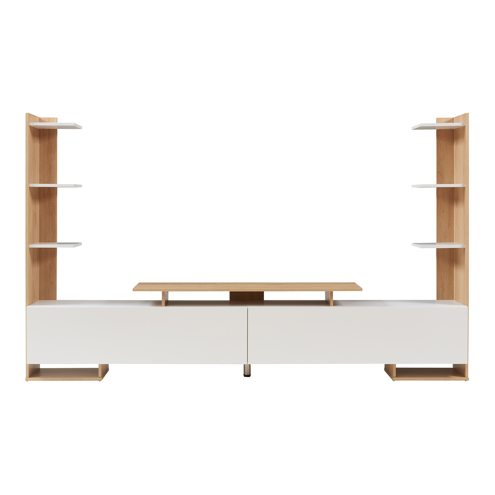 Blatul principal este potrivit pentru amplasarea televizorului, iar compartimentul deschis de dedesubt este excelent pentru receiver, DVD player, consolă sau alte echipamente. În plus, cele două rafturi laterale cu câte trei polițe fiecare oferă loc pentru cărți, rame foto, plante sau obiecte decorative. Cele două uși ascund un spațiu practic de depozitare, perfect pentru a păstra ordonat tot ce nu vrei la vedere.