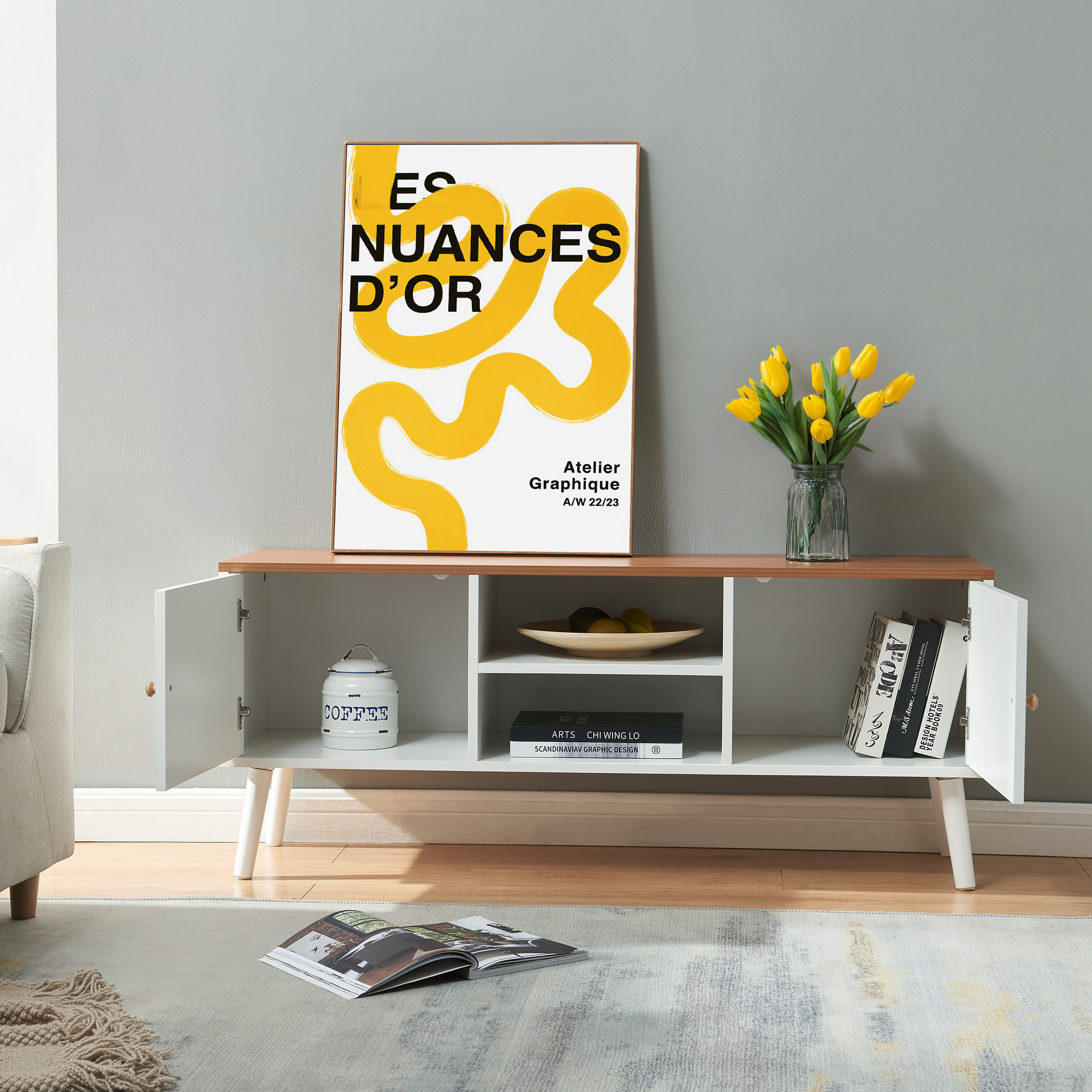 Datorită compartimentării bine gândite, această comodă TV pentru living dispune de o suprafață generoasă pentru televizor, două compartimente deschise în centru pentru consolă, receiver sau player media și două spații închise cu uși, perfecte pentru depozitarea discretă a DVD-urilor, jocurilor, cablurilor sau altor obiecte utile.