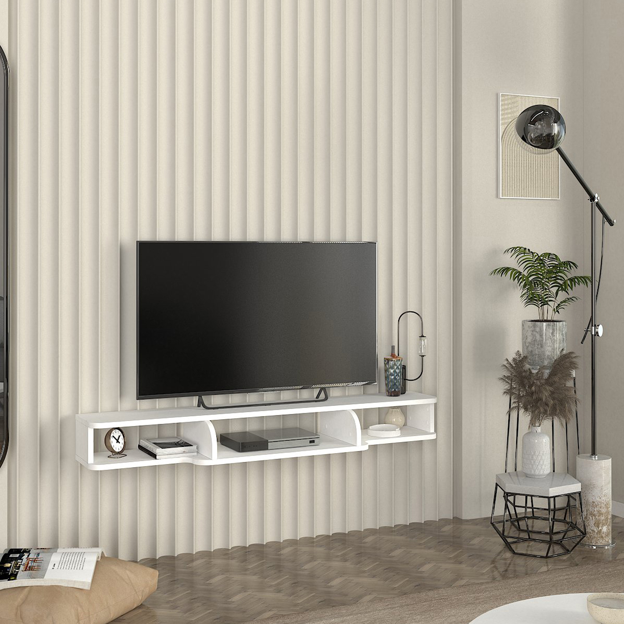 Comoda TV suspendată Aar este alegerea ideală pentru un living modern, ordonat și aerisit. Cu un design elegant și minimalist, această comodă TV suspendată albă se montează pe perete și oferă un aspect contemporan, potrivit în diverse stiluri de amenajare.