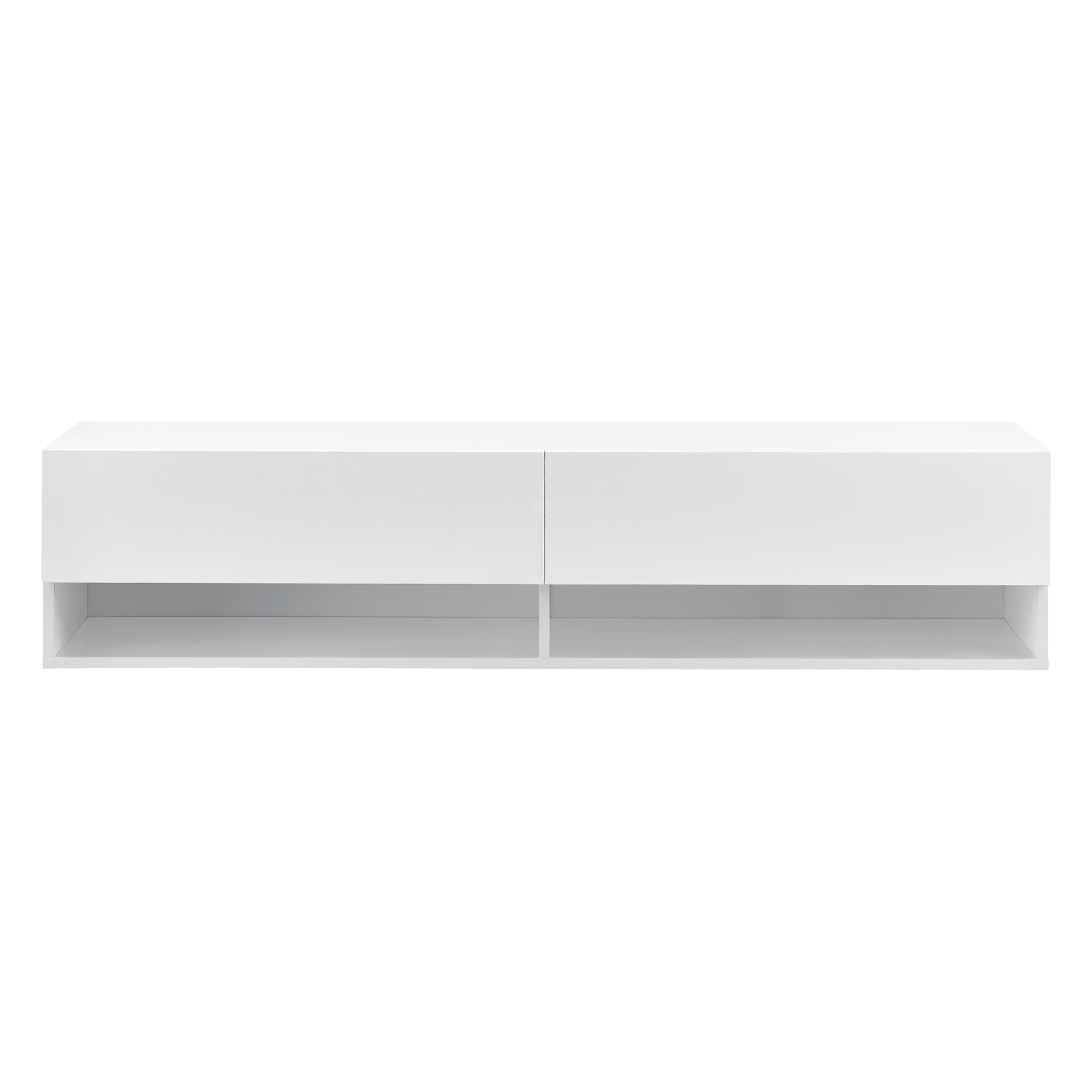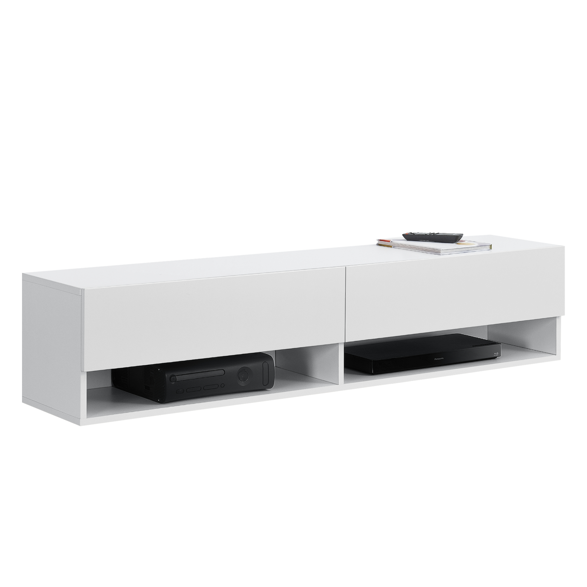 Datorită construcției suspendate, piesa de mobilier oferă un aspect contemporan și ajută la păstrarea unei atmosfere ordonate. Cele 2 uși de dulap cu deschidere separată și cele 2 compartimente deschise oferă spațiu util pentru organizarea accesoriilor, consolelor sau receiverelor. Finisajul alb se integrează ușor în decoruri minimaliste, scandinave sau moderne.