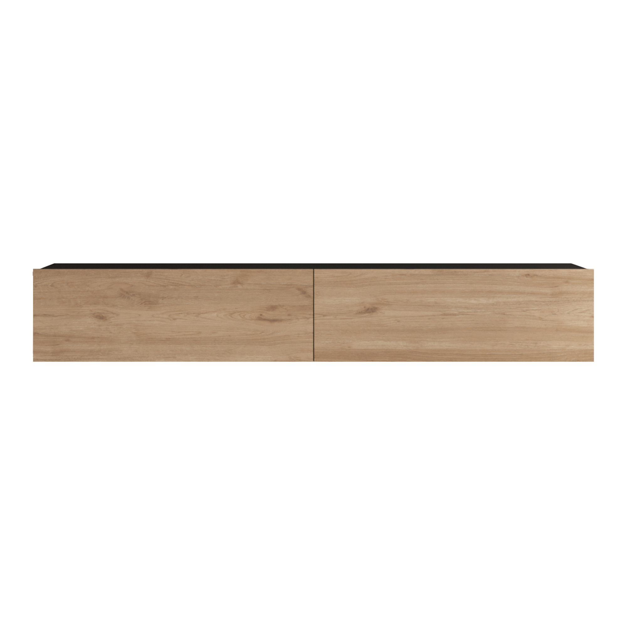 Se potrivește excelent în living, sub televizor, oferind atât funcționalitate, cât și un plus de stil. Nuanța caldă de stejar a fronturilor contrastează plăcut cu corpul negru, rezultând o mobilă TV pentru living cu aspect premium și ușor de asortat.