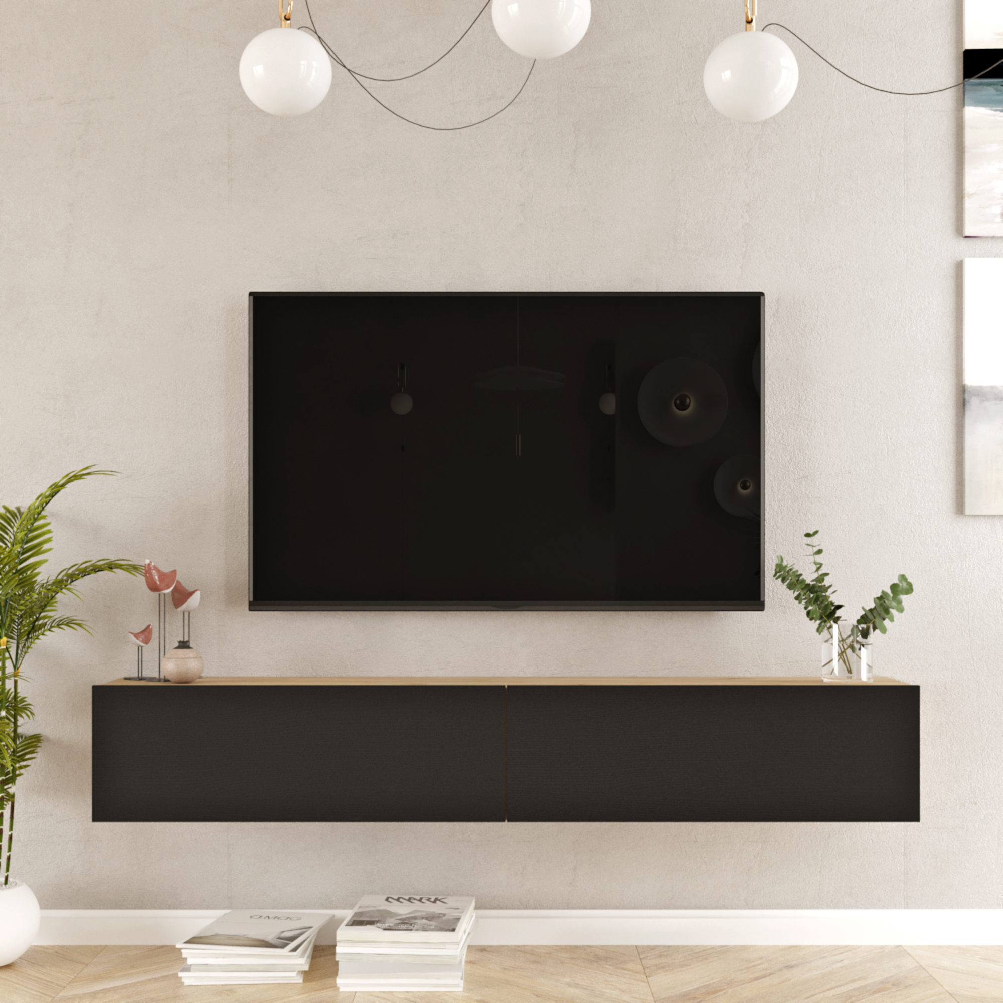 Comoda TV suspendată Lapinlahti este alegerea ideală pentru un living modern, ordonat și elegant. Cu un design decorativ și atemporal, această comodă TV suspendată în finisaj stejar și negru oferă un aspect contemporan și spațiu practic pentru organizarea obiectelor din zona media.
