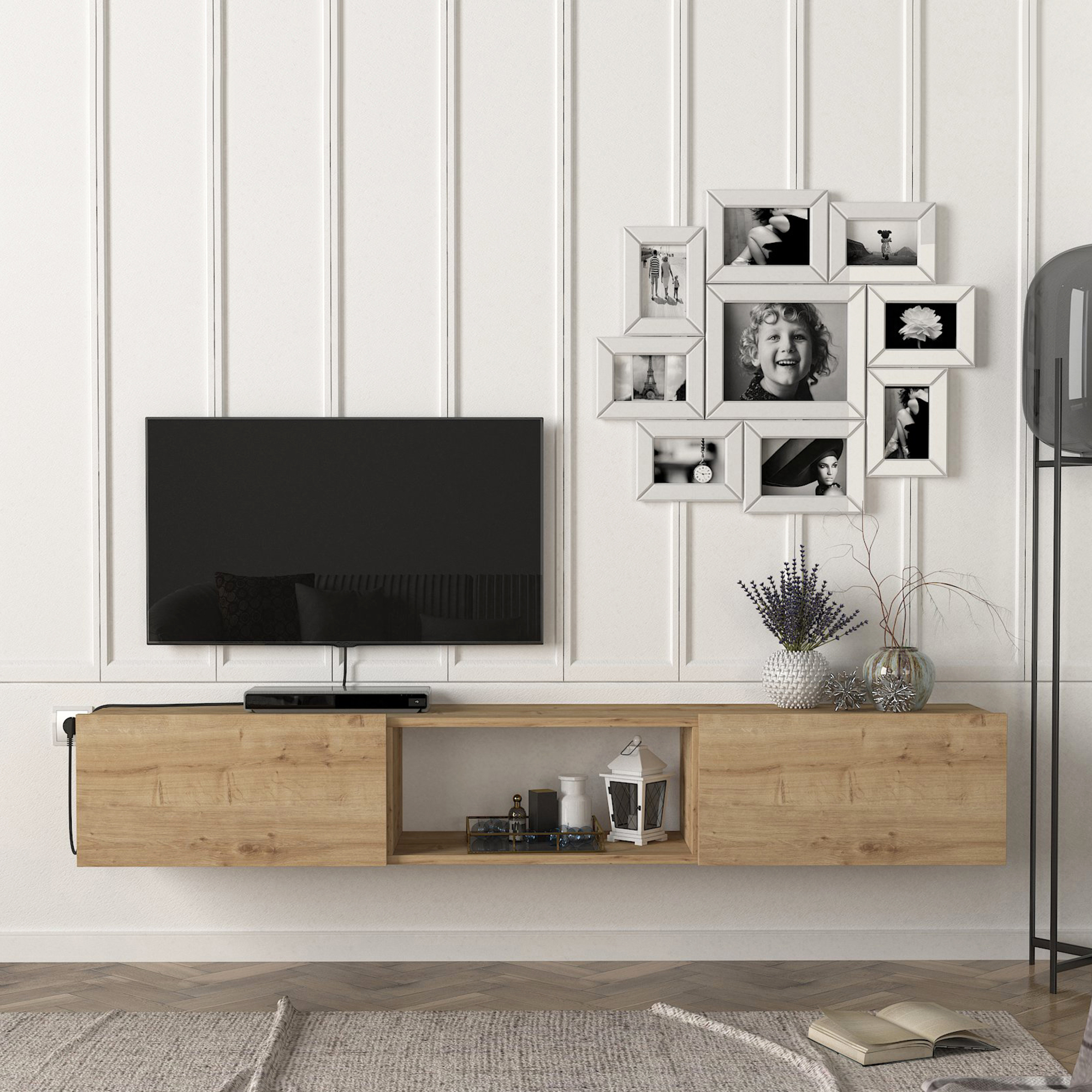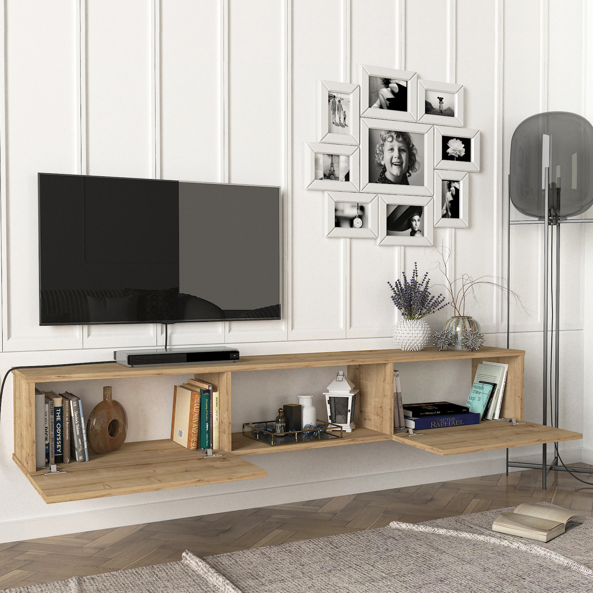 Comodă TV suspendată Paltamo este alegerea ideală pentru un living modern, aerisit și bine organizat. Cu un design elegant în finisaj stejar și montare pe perete, acest corp TV suspendat economisește spațiu și oferă un aspect contemporan zonei de entertainment.