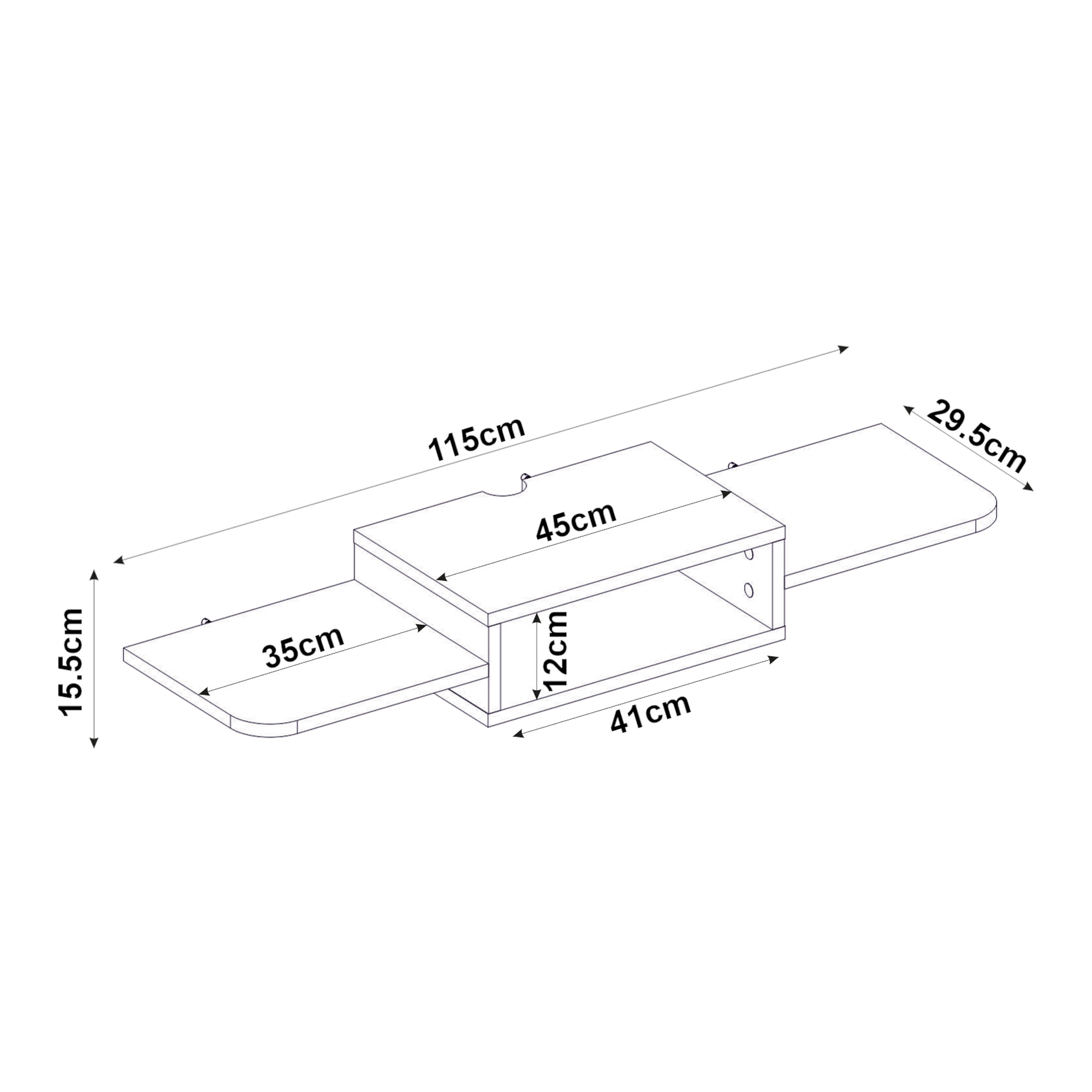 Datorită designului său minimalist, acest raft TV suspendat se integrează ușor în amenajări contemporane, scandinave sau clasice. Suprafața superioară este potrivită pentru televizor, compartimentul deschis central este ideal pentru aparatura media, iar rafturile laterale pot fi folosite pentru accesorii, telecomenzi sau obiecte decorative.