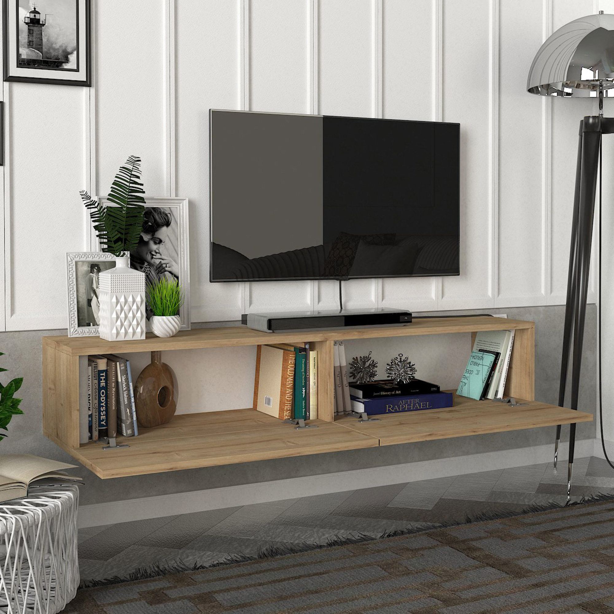 Cele 2 compartimente cu uși separate sunt ideale pentru depozitarea decodorului, consolei, telecomenzilor, DVD-urilor, jocurilor sau a altor accesorii. Datorită construcției compacte și aspectului minimalist, acest corp TV de perete se integrează ușor în amenajări moderne, scandinave sau contemporane.