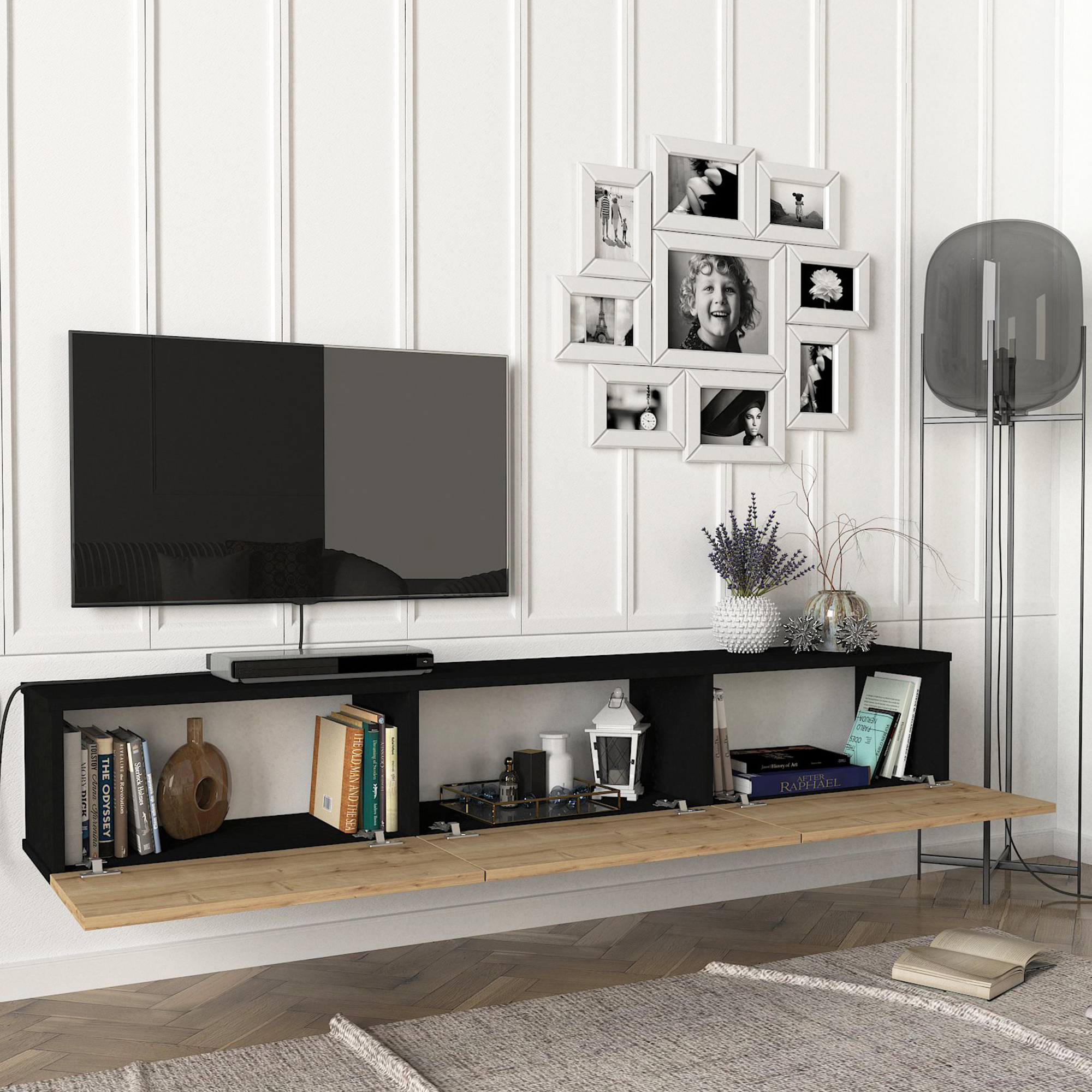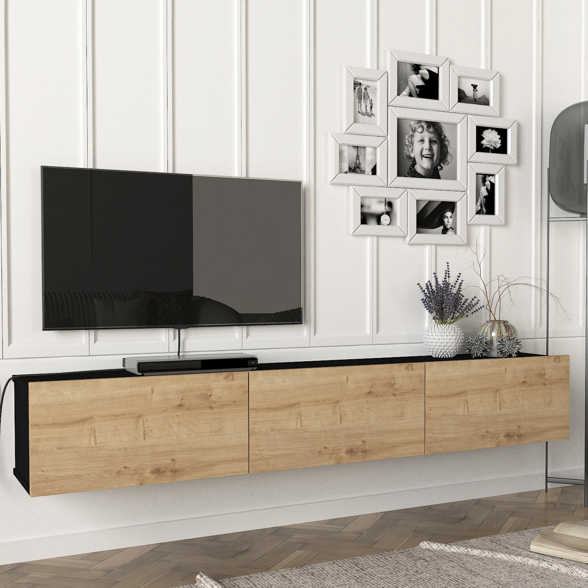 Datorită construcției suspendate, mobilierul creează un efect vizual ușor și ordonat, fiind potrivit pentru televizoare, console, accesorii media și alte obiecte utile din zona de entertainment. Cele 3 compartimente cu uși permit depozitarea separată și protejată a echipamentelor, jocurilor, cablurilor sau colecției de filme.