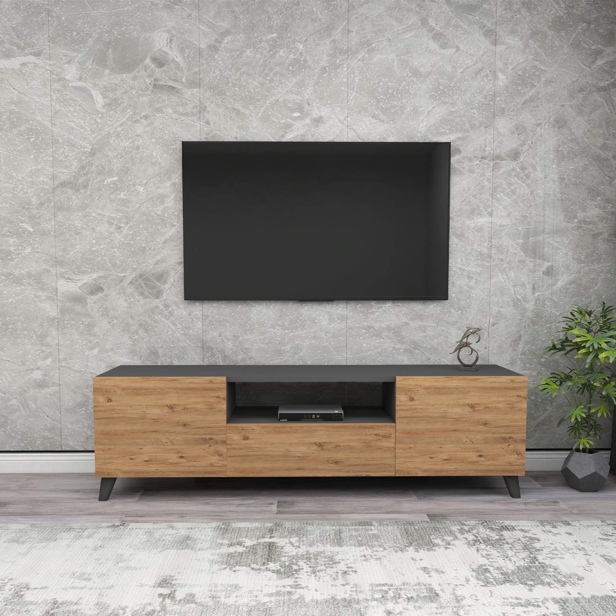 Raftul deschis din zona centrală este perfect pentru receiver, consolă de jocuri sau player media, iar cele 3 uși ascund eficient obiectele pe care vrei să le păstrezi la îndemână, dar ferite de vedere. Picioarele decorative contribuie la stabilitate, iar construcția compactă o face potrivită inclusiv pentru camere de zi amenajate eficient.