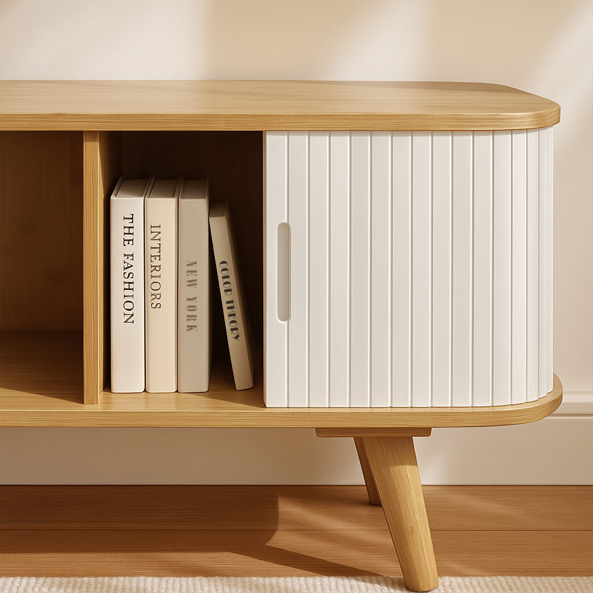 Comoda TV Tysvær este alegerea ideală pentru un living aerisit și bine organizat. Cu un design modern, inspirat din stilul scandinav, această comodă TV din bambus combină aspectul natural al lemnului cu fronturile crem elegante, pentru un decor cald și rafinat.