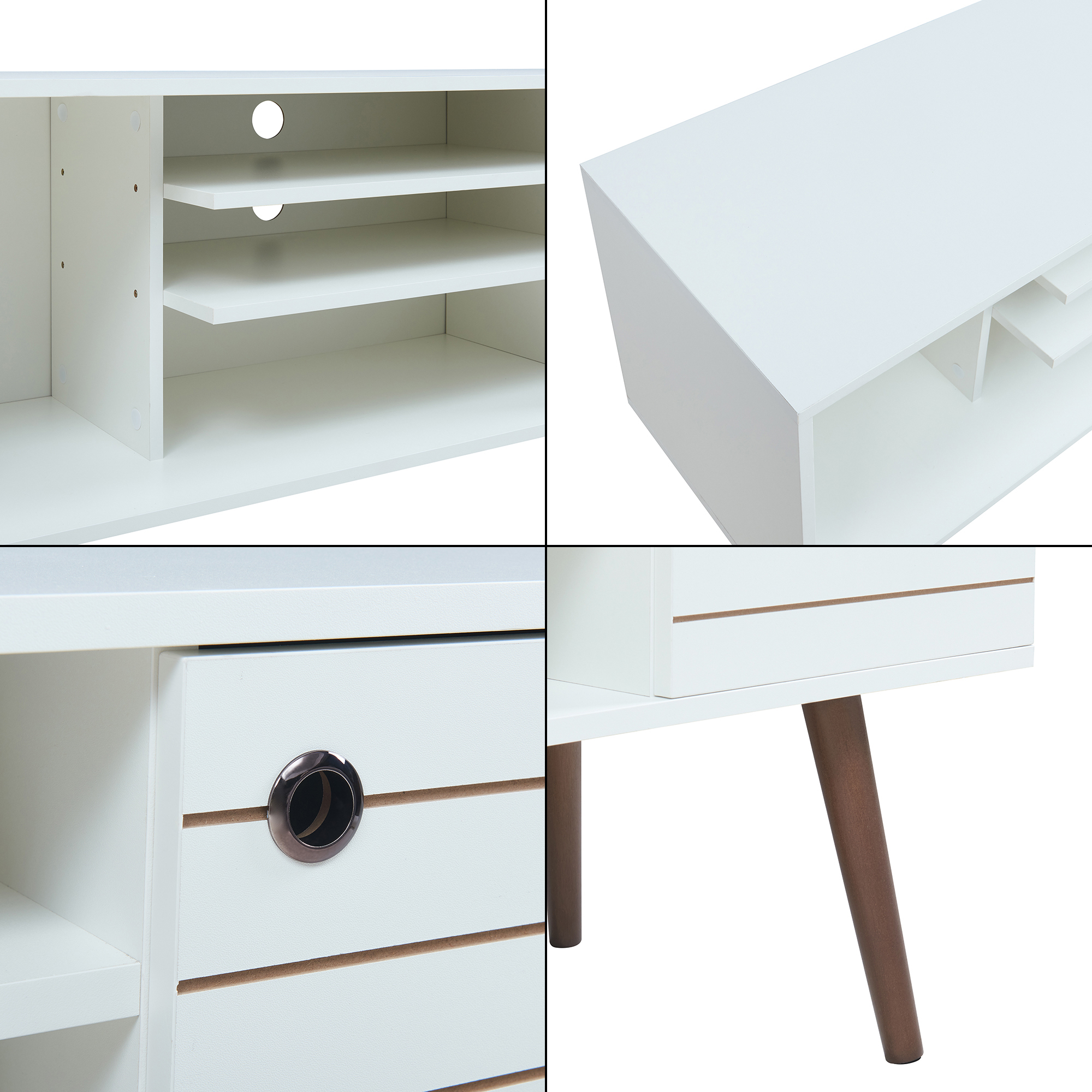 Comoda TV Vare este alegerea ideală pentru un living modern, aerisit și bine organizat. Cu un design elegant în nuanță albă și picioare cu aspect de nuc, această comodă TV se integrează ușor în decoruri contemporane, scandinave sau minimaliste.