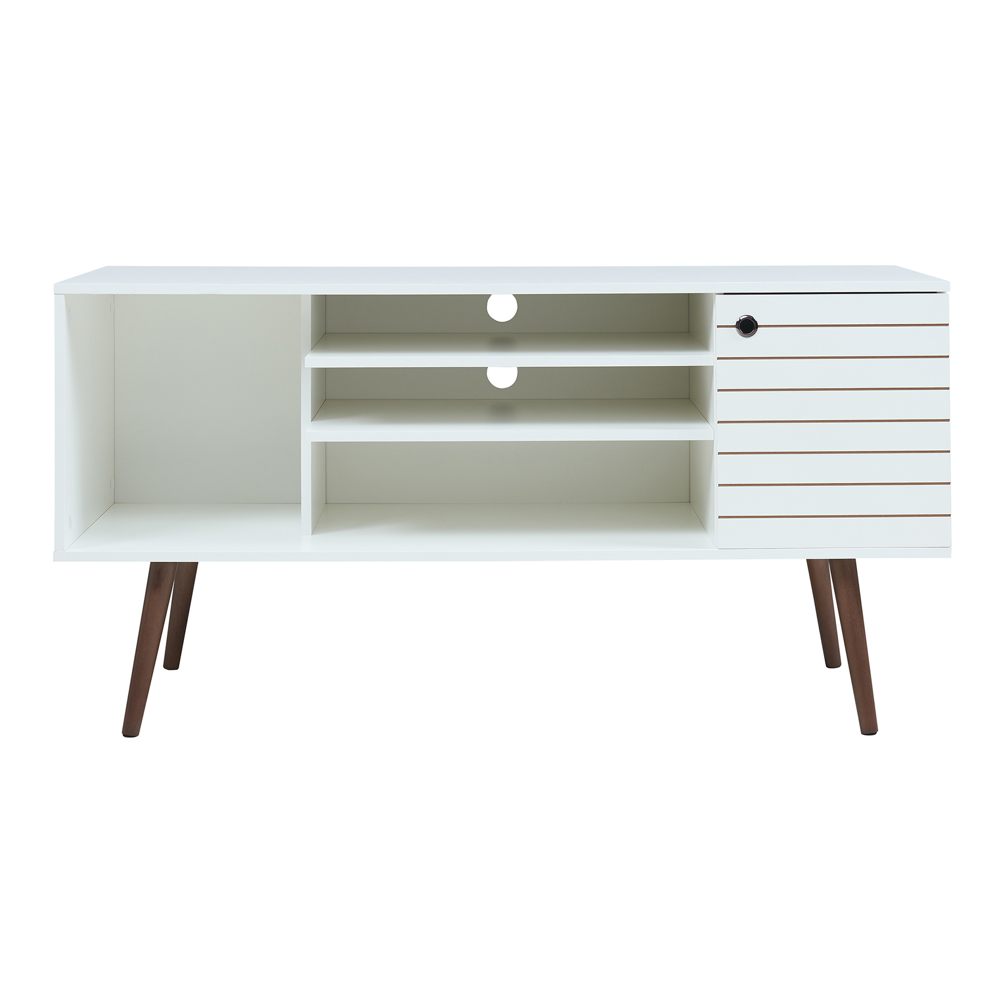 Comodă TV Vare 130x40x65,5 cm albă, cu rafturi și dulap, en.casa