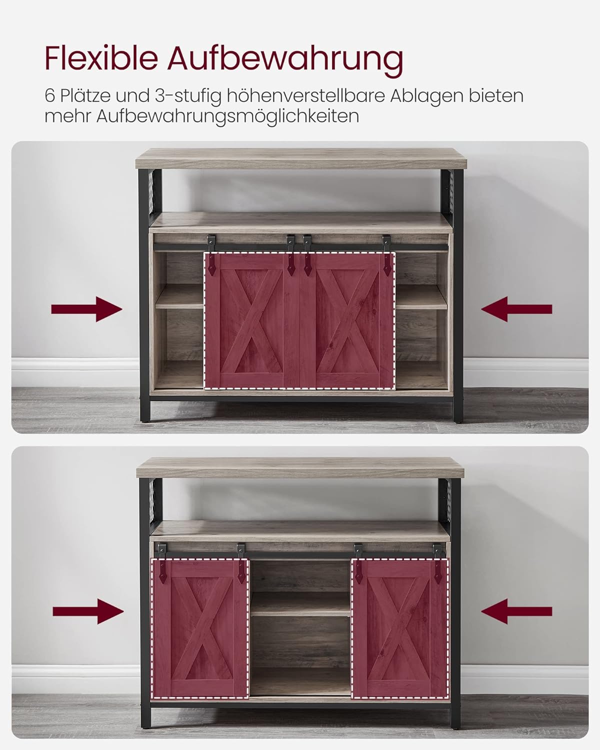 Alege o comodă rustică practică și elegantă pentru organizarea casei tale. Această comodă VASAGLE în nuanță gri combină aspectul cald al lemnului cu rezistența cadrului metalic, fiind potrivită atât ca mobilier pentru living, cât și ca dulap pentru bucătărie, consolă pentru hol sau spațiu de depozitare în birou. Designul cu 2 uși glisante tip hambar oferă un plus de stil și permite acces facil la compartimente.