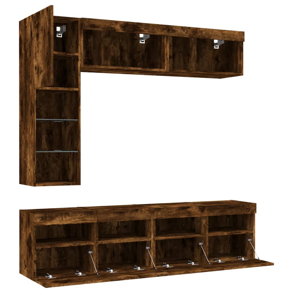 Comode TV de perete cu lumini LED, 7 piese, stejar fumuriu GartenMobel Dekor