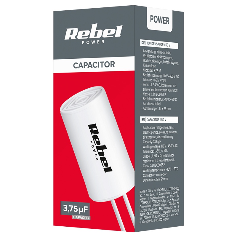 Acest condensator pentru motor monofazat Rebel, de 3,75µF, este proiectat pentru o pornire mai sigură și o funcționare stabilă a motoarelor. Se potrivește în multe aplicații casnice și industriale, precum pompe electrice, ventilatoare, frigidere și diverse motoare electrice, fiind o soluție practică atunci când ai nevoie de înlocuire rapidă și compatibilitate bună.