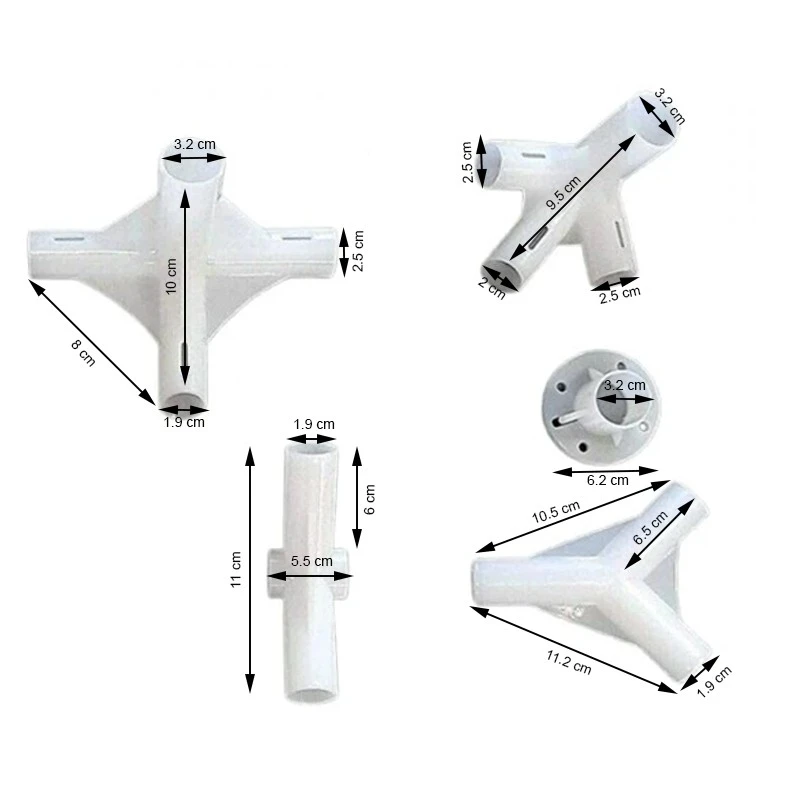 Acest set contine 15 accesorii-conectori pentru montarea corturilor de tip pavilion de gradina cu dimensiunea de 3x6 metri. Toate cele 15 piese sunt confectionate din ABS rezistent si sunt foarte usor de montat. Pachetul include 4 conectori pentru colturi, 2 conectori centrali, 2 conectori pentru acoperis, 1 conector pentru centrul acoperisului si 6 conectori pentru picioare.