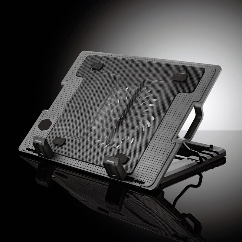 Reglarea pe înălțime a suportului permite setarea acestuia în 4 poziții. Este echipat suplimentar cu 2 prize USB și iluminare de fundal LED. Este conceput pentru laptopuri cu o dimensiune a ecranului de până la 15,6 inchi.