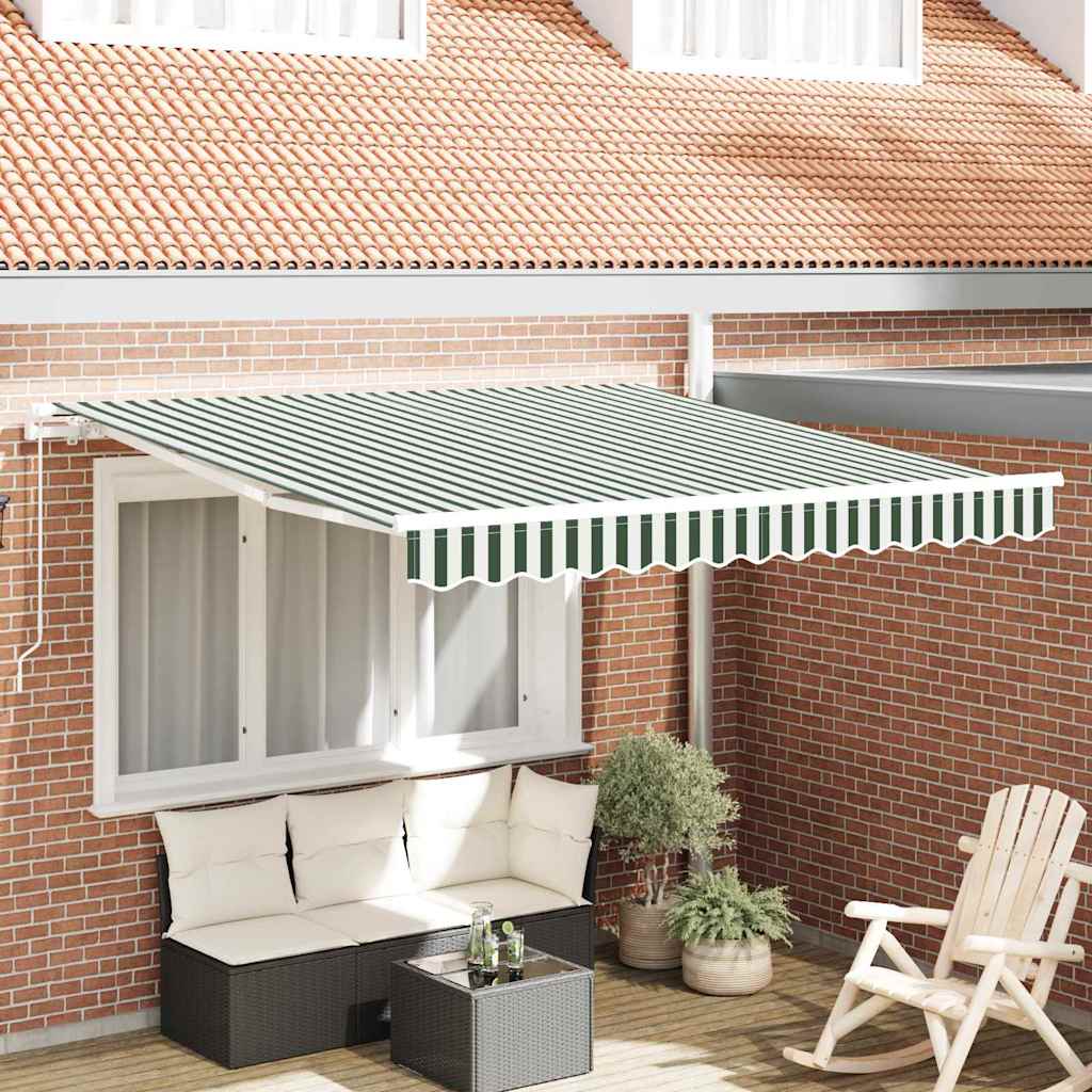 Această marchiză mare combină eleganța cu utilitatea și se potrivește perfect în spațiile exterioare moderne. Cu combinația sa atrăgătoare de culori verde și alb și o construcție durabilă, îți oferă o umbră considerabilă, perfectă pentru cine, relaxare sau distracție în zilele calde.
