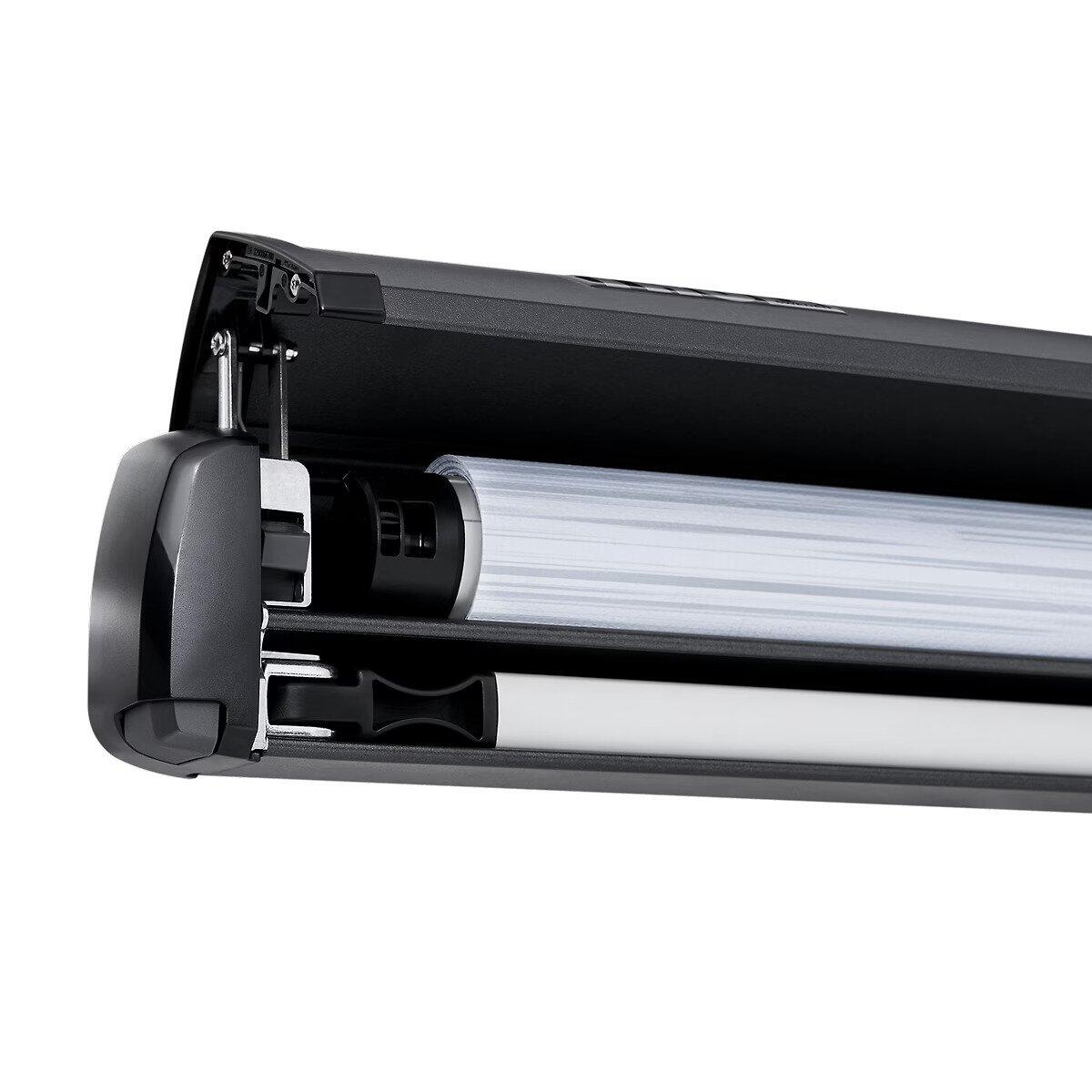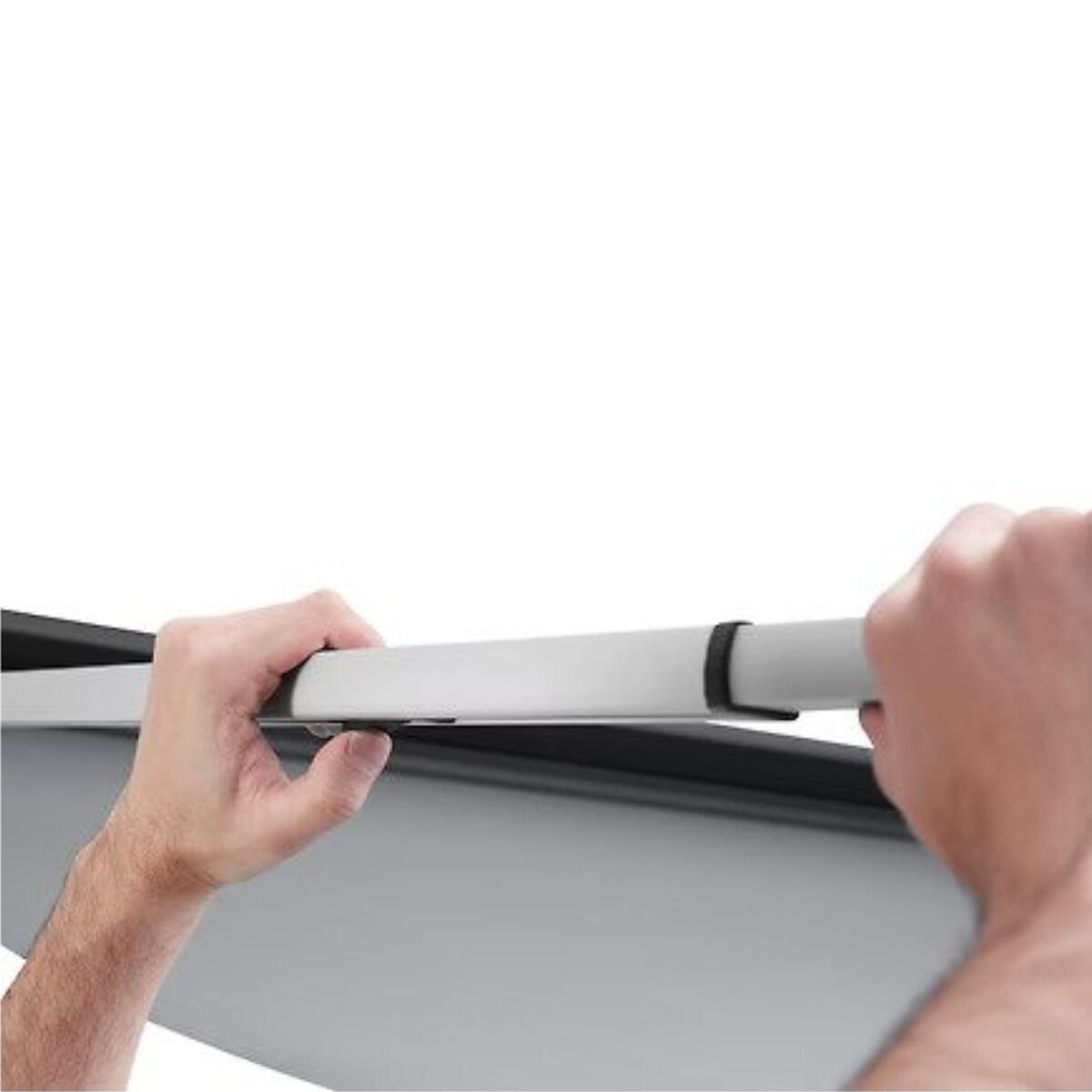 - Copertina cu tesatura rezistenta este protejata de o carcasa durabila si usoara din aluminiu cand nu este extinsa.