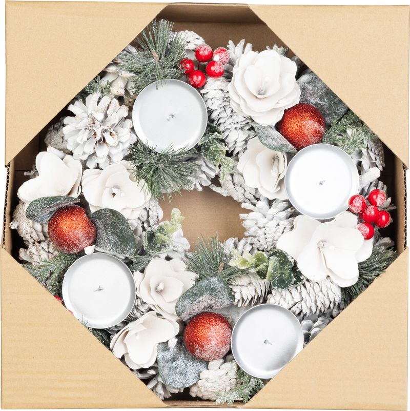 Această coroniță de Crăciun creează o atmosferă caldă și rafinată, fiind potrivită pentru interioare clasice, rustice sau moderne. Designul său decorativ, cu elemente naturale și suport pentru lumânări, o transformă într-o alegere practică și estetică pentru perioada Adventului.