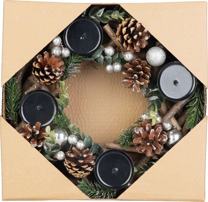 Designul sau imbina aspectul rustic al lemnului cu detalii decorative inspirate din natura, precum conuri si ramuri verzi, pentru un efect vizual deosebit. Aceasta coronita de Craciun este prevazuta cu suporturi pentru lumanari tip pastila, fiind ideala pentru decorarea interioara in stil traditional sau modern.