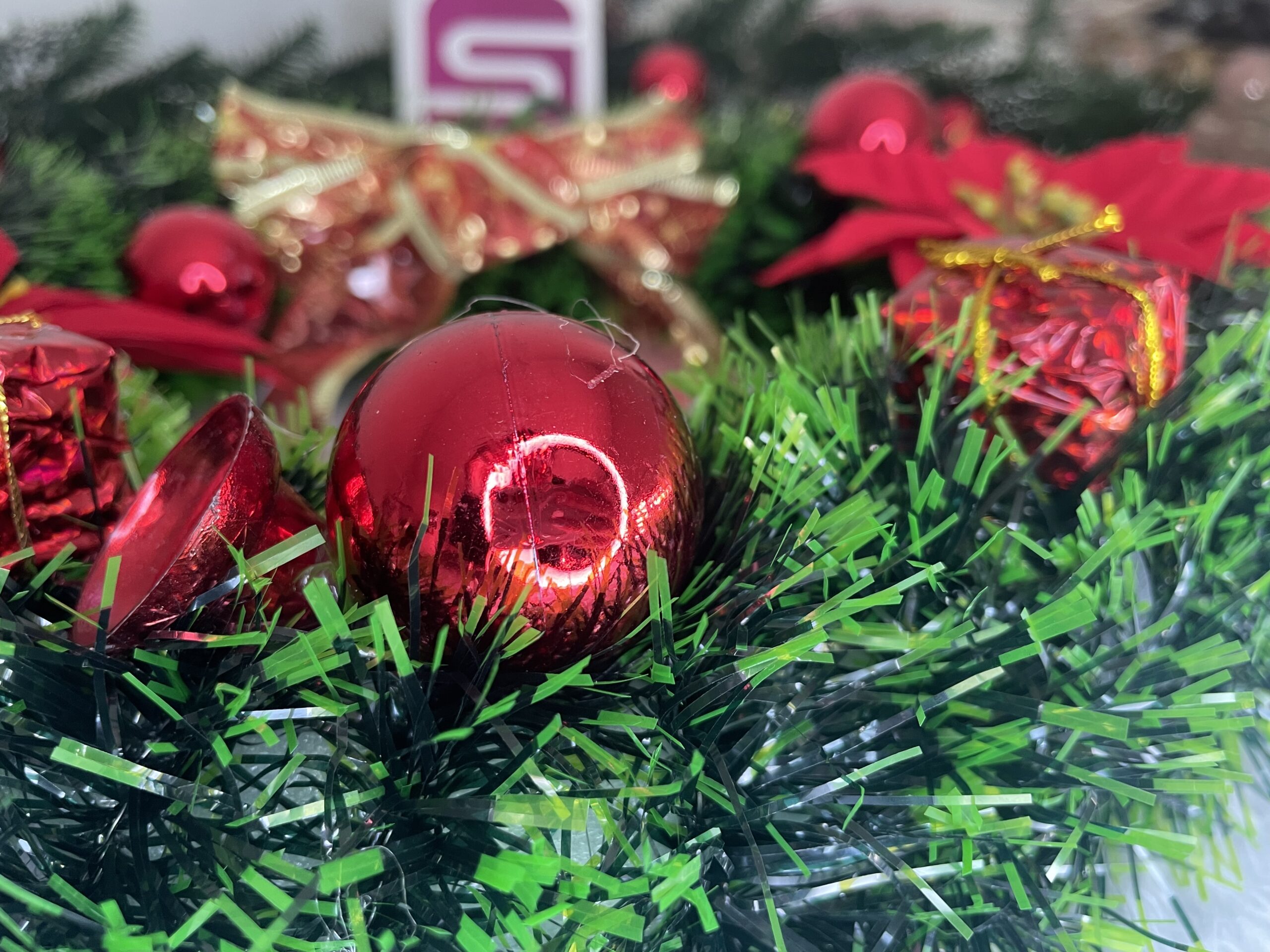Adu farmecul sarbatorilor in casa ta cu aceasta coronita de Craciun de 35 cm, realizata din brad artificial cu aspect bogat si decorata festiv in nuante de verde, rosu si auriu. Este alegerea potrivita pentru cei care vor un decor gata pregatit, elegant si usor de amplasat pe usa, perete, fereastra sau chiar pe masa de Craciun.