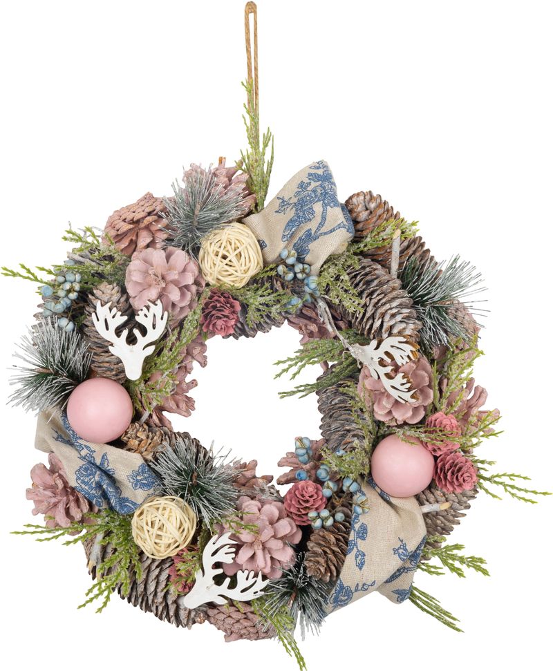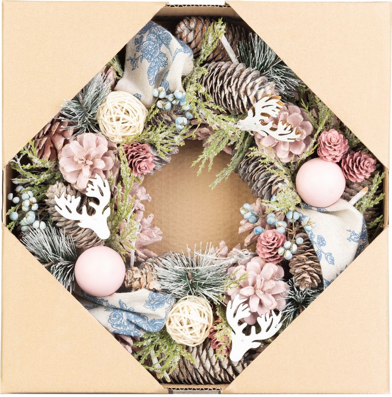 Adaugă un plus de farmec sărbătorilor cu această coroniță de Crăciun vintage de la MagicHome, creată pentru a oferi locuinței tale o atmosferă caldă, elegantă și primitoare. Decorată cu conuri naturale, flori decorative, globuri și accente în tonuri delicate de roz, verde și oranj, această decorațiune de Crăciun pentru ușă sau perete se potrivește perfect în interioare moderne, rustice sau romantice.