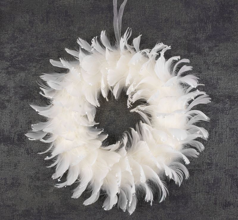 Coronita decorativa alba cu pene, suspendata, pentru Craciun, 35 cm