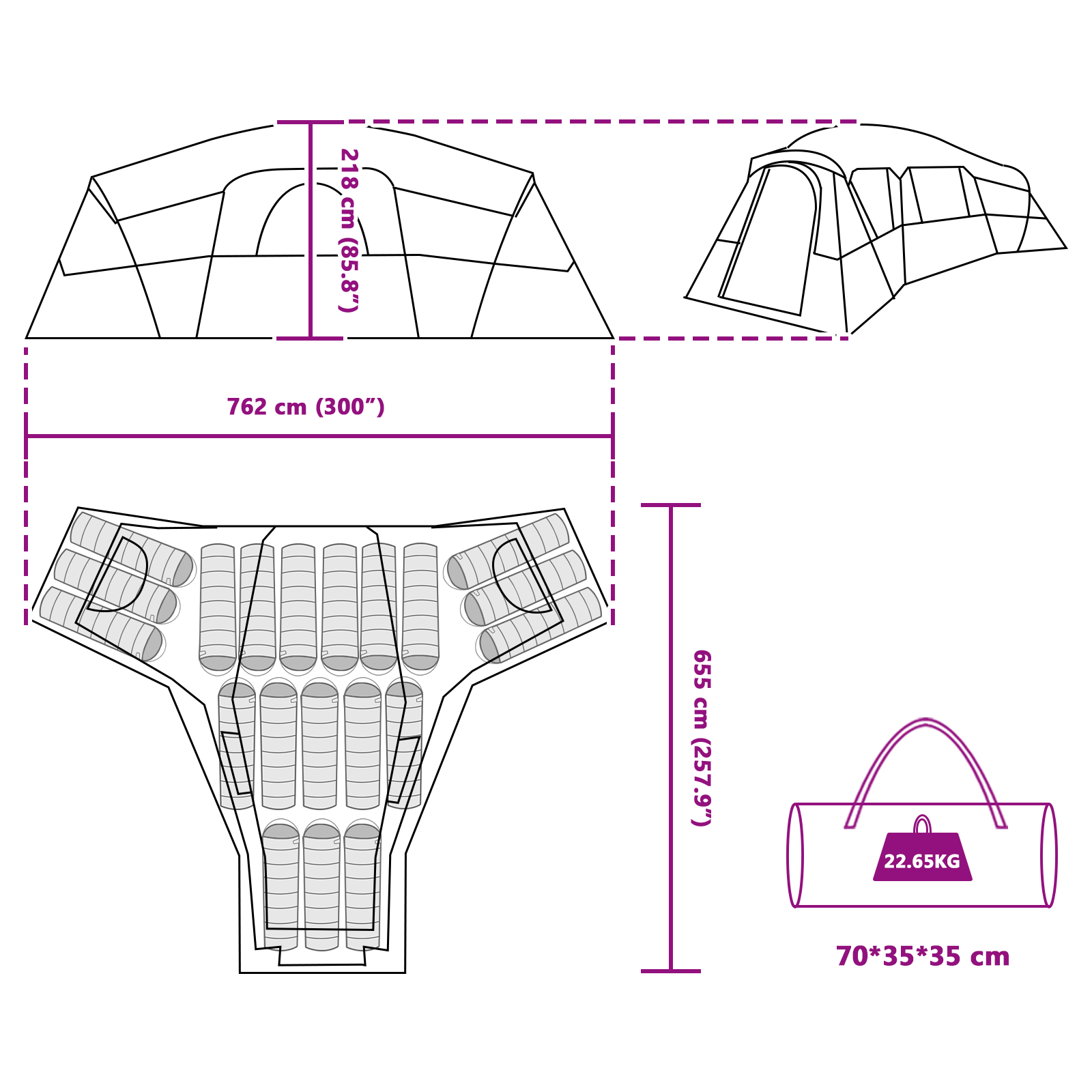 Cortul ăsta de camping îți oferă mult spațiu când ești în mijlocul naturii. E perfect pentru familii și grupuri, având dimensiunile de 762 x 655 x 218 cm. Cu un design modern și practic, e clar că îți va îmbunătăți aventura de camping.